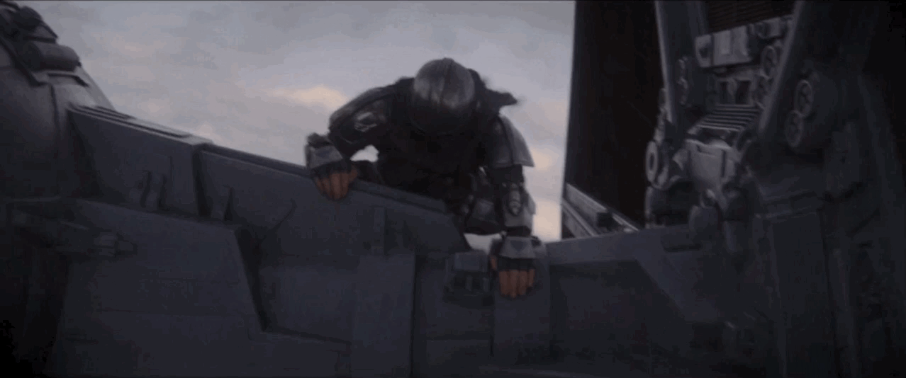 Somewhere, Watson found his solution. “I thought of a flag on a moderately windy day, how it flops and rolls in wave-like motions. I thought of a flag in a hurricane; it blows straight and will stay in that position if the wind stays consistent from the same direction.” Watson reasoned that the high speed of the scene would “literally make it impossible to hold on,” and that after Mando uses his gadgets to get on the ship, “the viewer will subconsciously disregard questions that might come up how he is holding on.”