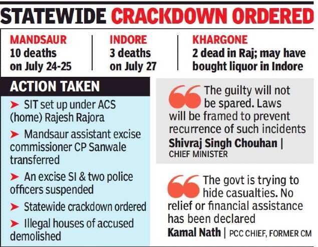 INDORE: The death toll in the alleged Mandsaur hooch tragedy rose to10 on Tuesday, even as alarming reports came in of three deaths after a booze party in Indore city, and two men from MP’s Khargone dying in Chittorgarh, Rajasthan, after consuming liquor.