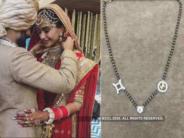 Sonam Kapoor Ahuja opted for a mangalsutra with two little solitaires with the sun-signs of the couple.