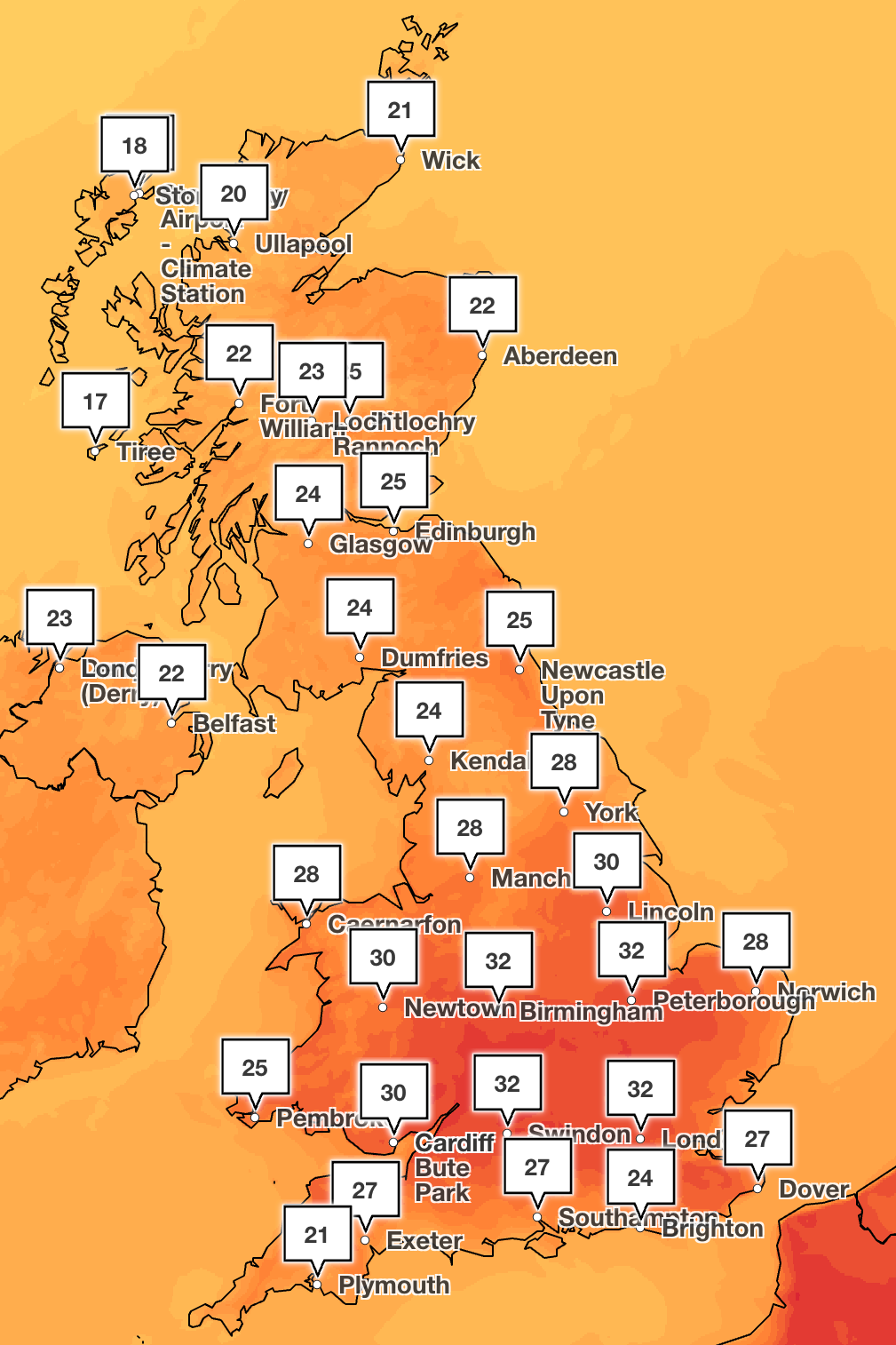 The heat is set to peak in the mid-thirties in the south of England, according to the Met Office, with London marking 32C on Tuesday.