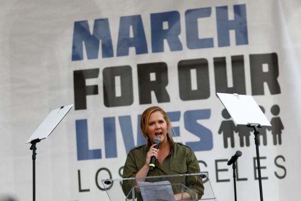 At Saturday’s march in Los Angeles, comedienne Amy Schumer, a showing of whose film Trainwreck was the scene of a 2015 shooting in a Louisiana theatre, spoke passionately against gun violence and the National Rifle Association (NRA) lobbying group at a gathering said to be 50,000-strong.