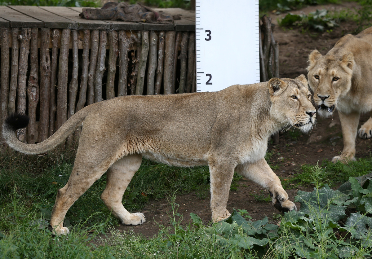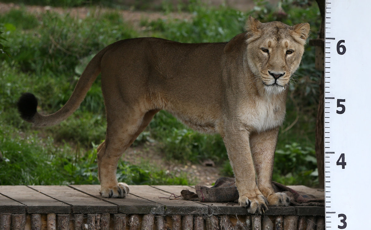 A lion stand by a large ruler during photocall for the annual weigh-in at London Zoo in London, Britain August 24, 2017. REUTERS/Neil Hall