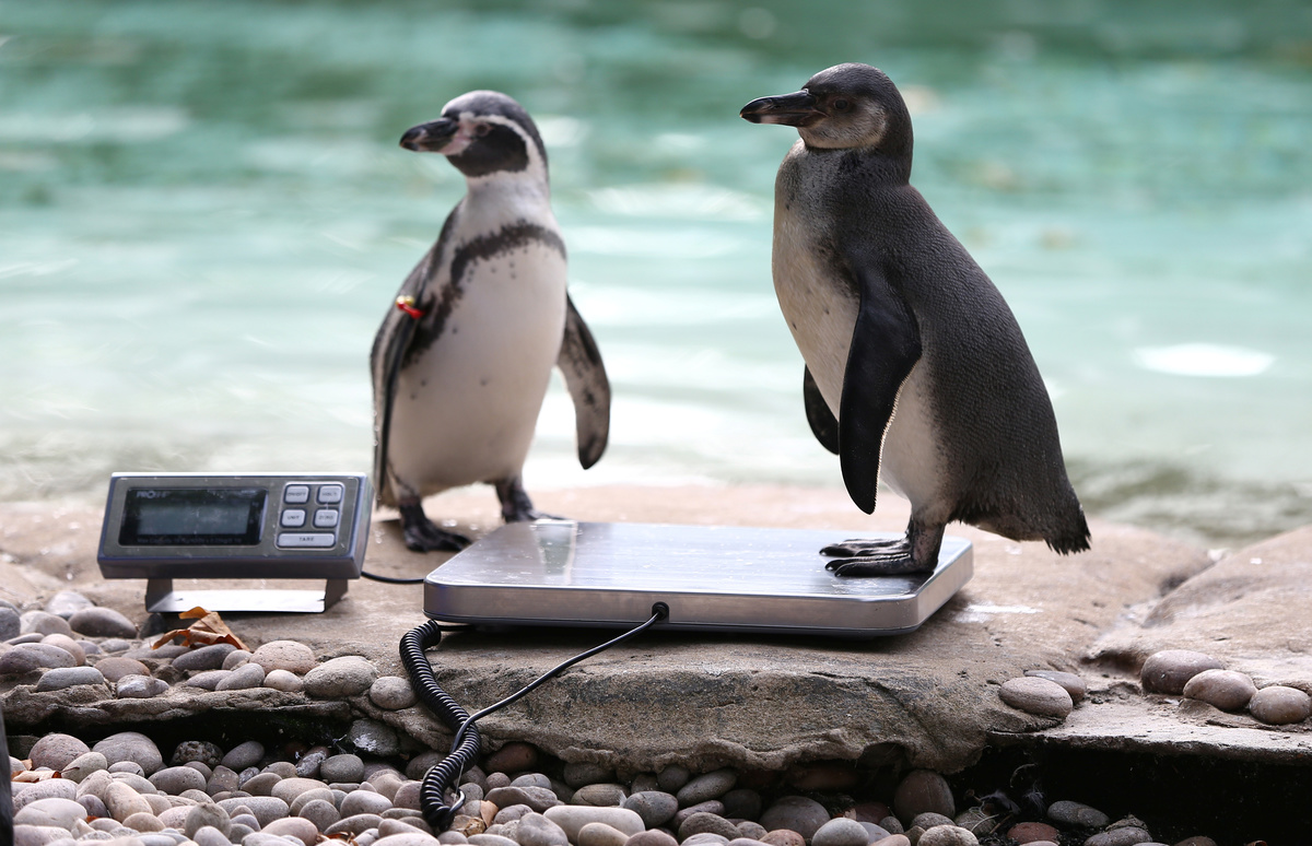 A penguin steps on scales during a photocall for the annual weigh-in at London Zoo in London, Britain August 24, 2017. REUTERS/Neil Hall