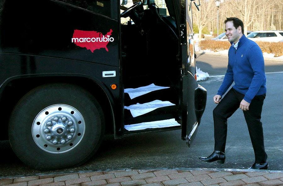 It was one press image of Mr Rubio preparing to step onto his campaign battle bus that first caught the attention of one of the other campaigns. After spotting that the young senator from Florida was sporting rather shiny ankle-high boots with heels on the generous side, a top press aide to Senator Ted Cruz, released the following tweet: “A Vote for Marco Rubio Is a Vote for Men’s High-Heeled Booties.”
