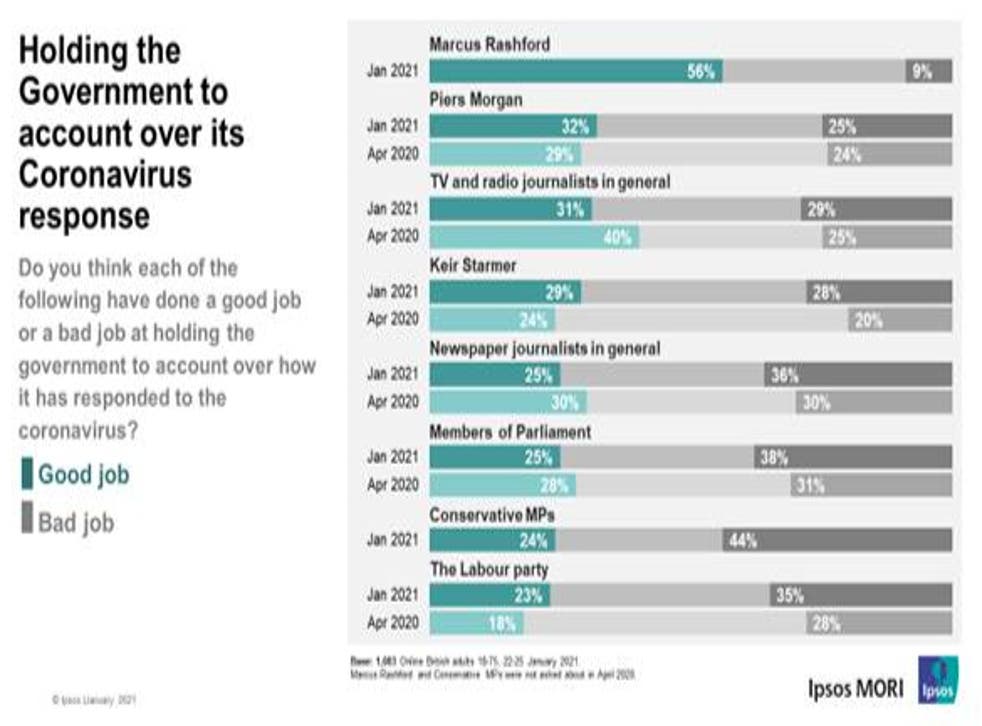 More than half of British citizens believe Manchester United striker Marcus Rashford is doing a better job of holding the UK government to account over its response to the coronavirus pandemic than either Labour leader Sir Keir Starmer or the national media.