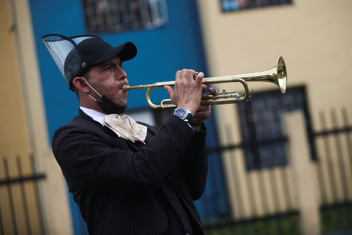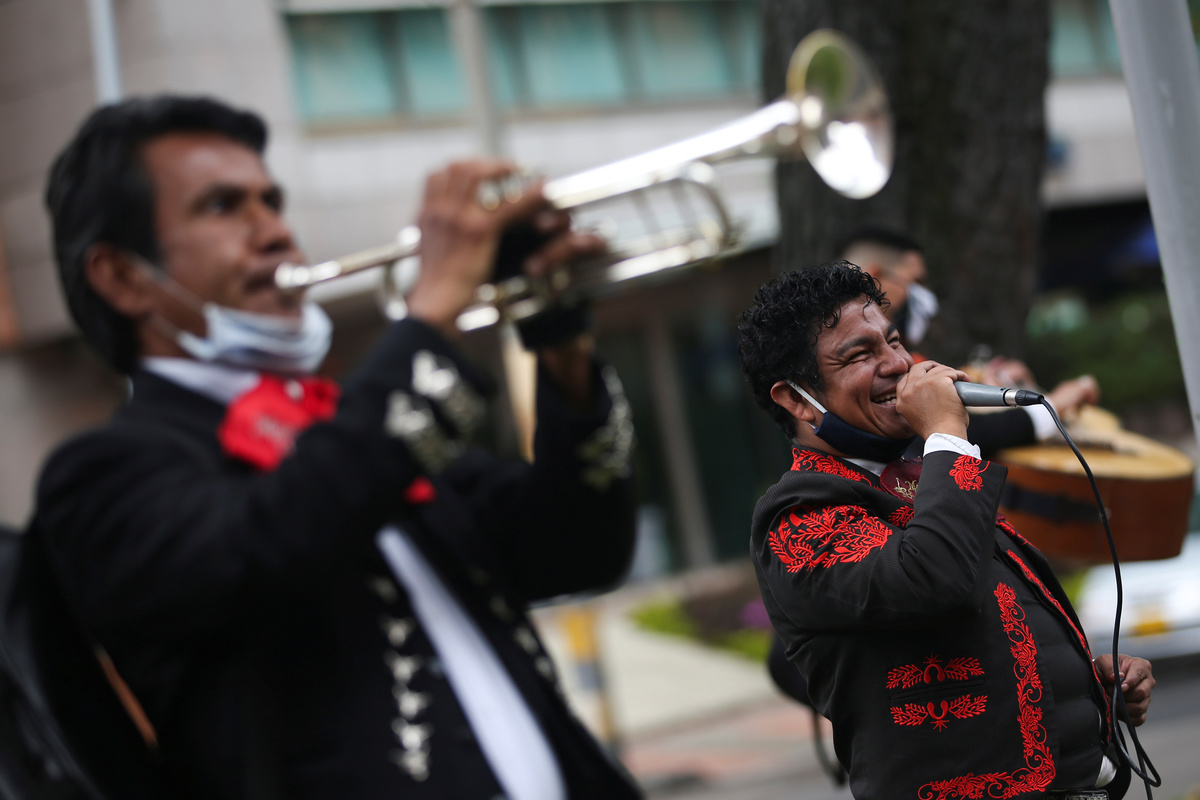 The boisterous music - usually heard at family celebrations and raucous birthdays - bursts through the eerily quiet streets of Colombia's capital, Bogota. The mariachis have arrived.