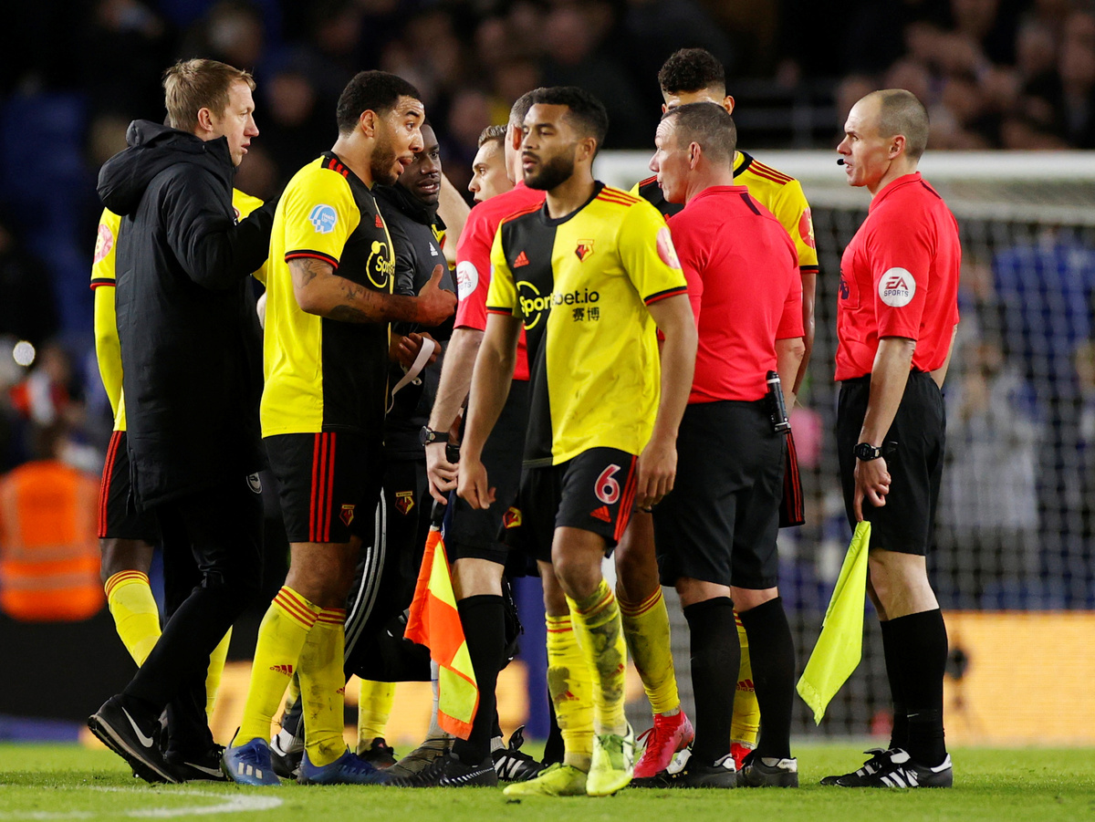 Soccer Football - Premier League - Brighton & Hove Albion v Watford - The American Express Community Stadium, Brighton, Britain - February 8, 2020 Watford's Adrian Mariappa looks dejected after the match as Troy Deeney speaks with the match officials Action Images via Reuters/John Sibley