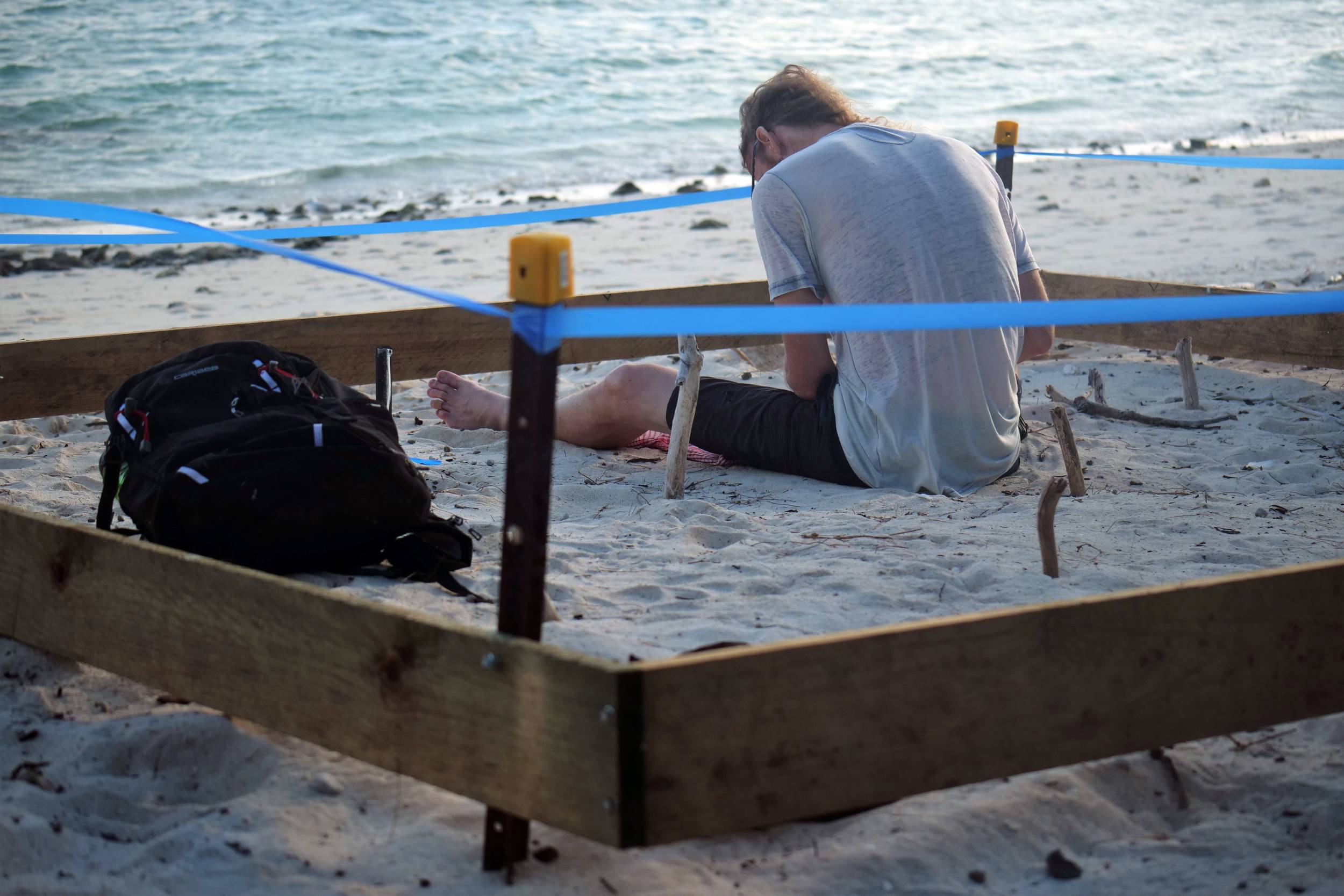 In each hatchery plot — a series of wooden, rectangular frames at the top of a sand dune — he has relocated 10 nests and left enough space between each, so they won't interact with each other.
