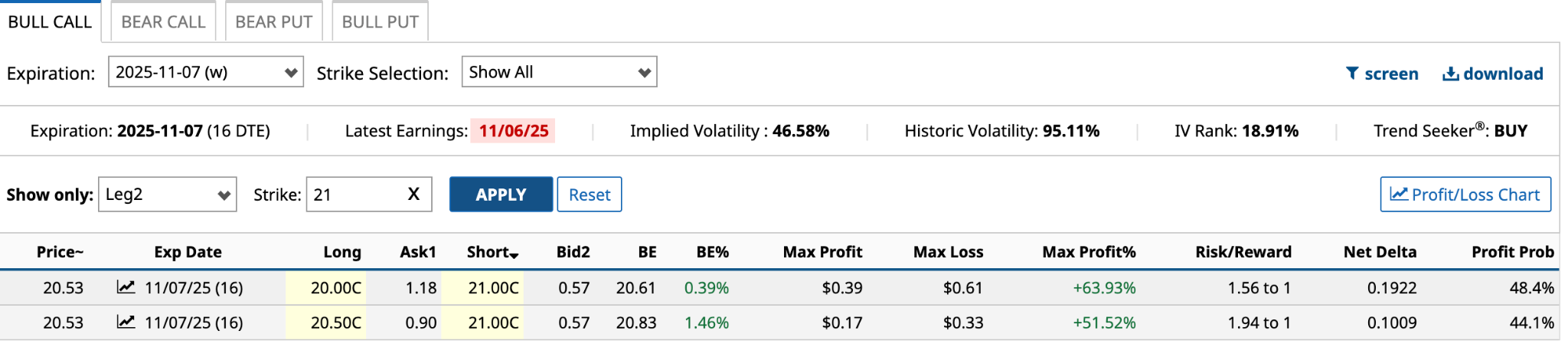 If you’re bullish, I think you have to go with the Nov. 7 combination. It costs less and has the best chance of reaching the breakeven price of $20.92 [$21 strike price - $0.08 net debit].