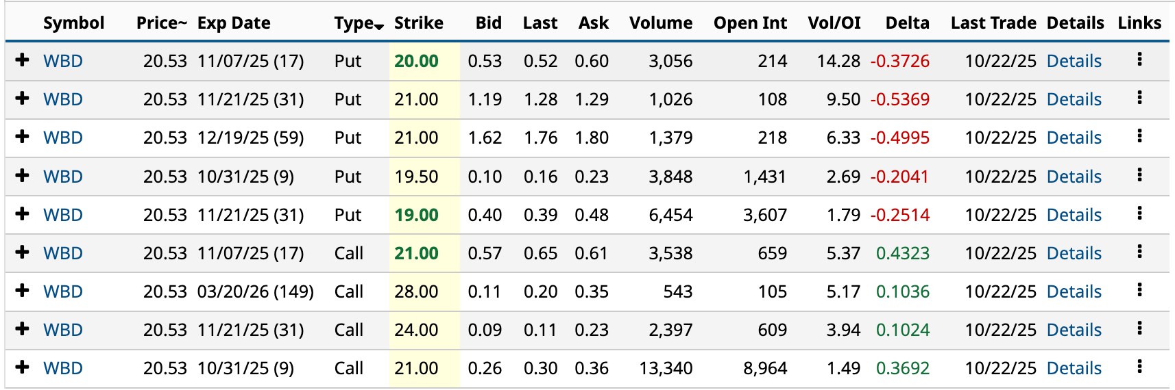 There were five unusually active puts yesterday. If you want income and want the puts to expire worthless, you’d sell them with OTM strike prices. On the other hand, if you are looking to acquire more WBD shares, puts that are ATM (at the money) or slightly ITM (in the money) make sense.