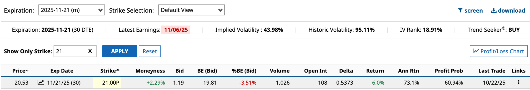 For stock acquisition, go for one of the $21 strikes. If you’re really bullish and think earnings on Nov. 6 will be positive, or a bona fide offer will surface, the Nov. 21 $21 put generates an annualized return of 73.1% with a breakeven of $19.81