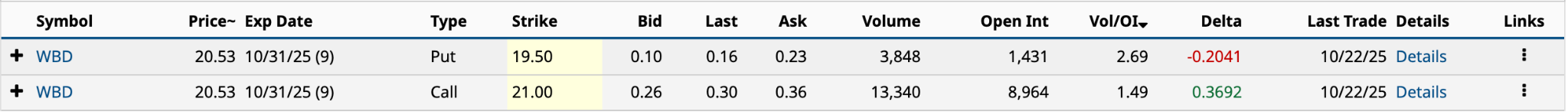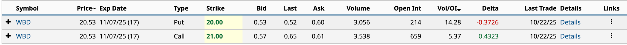 On Wednesday, WBD’s share volume was 52.23 million, nearly 20 million higher than its 30-day average. Meanwhile, its options volume was 219,639, nearly double its 30-day average, and the seventh-highest so far in 2025—all seven in September or October.