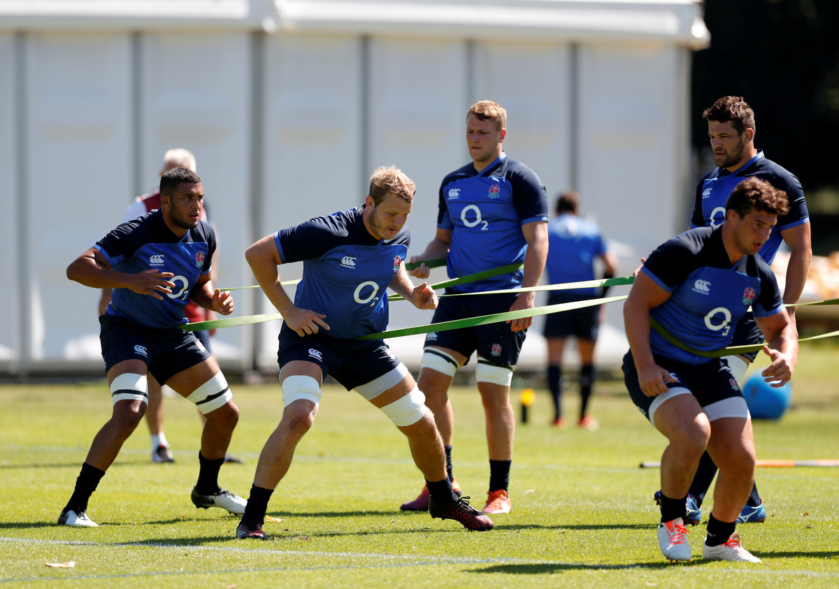 England training squad ForwardsDan Cole (Leicester Tigers, 85 caps)Luke Cowan-Dickie (Exeter Chiefs, 11 caps)Tom Curry (Sale Sharks, 10 caps)Charlie Ewels (Bath Rugby, 10 caps)Ellis Genge (Leicester Tigers, 9 caps)Jamie George (Saracens, 37 caps)Maro Itoje (Saracens, 27 caps)Joe Launchbury (Wasps, 58 caps)Courtney Lawes (Northampton Saints, 71 caps)Lewis Ludlam (Northampton Saints, uncapped)Joe Marler (Harlequins, 59 caps)Ben Moon (Exeter Chiefs, 8 caps)Brad Shields (Wasps, 8 caps)Kyle Sinckler (Harlequins, 22 caps)Jack Singleton (Saracens, uncapped)Sam Underhill (Bath Rugby 9 caps)Billy Vunipola (Saracens, 41 caps)Harry Williams (Exeter Chiefs, 17 caps)Mark Wilson (Sale Sharks, 13 caps)BacksDanny Cipriani (Gloucester Rugby, 16 caps)Joe Cokanasiga (Bath Rugby, 4 caps)Elliot Daly (Saracens, 30 caps)Owen Farrell (Saracens, 70 caps)George Ford (Leicester Tigers, 55 caps)Piers Francis (Northampton Saints, 4 caps)Willi Heinz (Gloucester Rugby, uncapped)Jonathan Joseph (Bath Rugby, 40 caps)Jonny May (Leicester Tigers, 45 caps)Ruaridh McConnochie (Bath Rugby, uncapped)Henry Slade (Exeter Chiefs, 22 caps)Ben Spencer (Saracens, 3 caps)Ben Te’o (unattached, 18 caps)Manu Tuilagi (Leicester Tigers, 32 caps)Anthony Watson (Bath Rugby, 33 caps)Ben Youngs (Leicester Tigers, 85 caps)In camp for rehabilitationGeorge Kruis (Saracens, 32 caps)Jack Nowell (Exeter Chiefs, 33 caps)Mako Vunipola (Saracens, 53 caps)