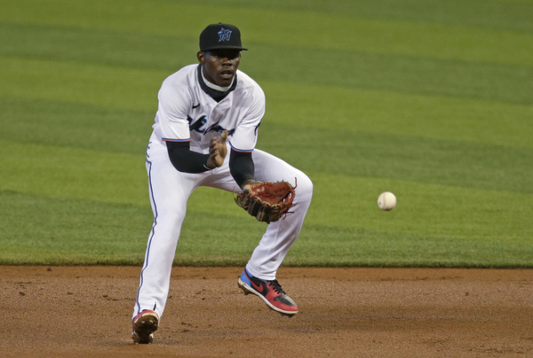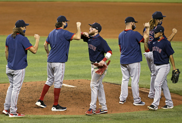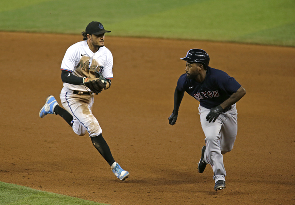 Miami Marlins shortstop Miguel Rojas (19) chase down Boston Red Sox center fielder Jackie Bradley Jr. (19) during the eight inning of a baseball game at at Marlins Park in Miami on Thursday, September 17, 2020. (David Santiago/Miami Herald/TNS)Boston Red Sox third baseman Rafael Devers (11) is congratulated by teammates after hitting three run home run during the seventh inning of a baseball game against the Miami Marlins at at Marlins Park in Miami on Thursday, September 17, 2020. (David Santiago/Miami Herald/TNS) Boston Red Sox players celebrate their 5-3 win over the Miami Marlins during a baseball game at at Marlins Park in Miami on Thursday, September 17, 2020. (David Santiago/Miami Herald/TNS)Boston Red Sox pitcher Nathan Eovaldi (17) pitches against the Miami Marlins during the third inning of a baseball game at Marlins Park in Miami on Thursday, September 17, 2020.(David Santiago/Miami Herald/TNS)Miami Marlins second baseman Jazz Chisholm (70) fields a grounds ball hit by Boston Red Sox right fielder Alex Verdugo (99)during the third inning of a baseball game at at Marlins Park in Miami on Thursday, September 17, 2020. (David Santiago/Miami Herald/TNS)Miami Marlins catcher Chad Wallach (17) hits aa RBI single during the seventh inning of a baseball game against the Boston Red Sox at at Marlins Park in Miami on Thursday, September 17, 2020. (David Santiago/Miami Herald/TNS)Miami Marlins pitcher Jose Urena (62) pitches against the Red Sox during the third inning of a baseball game at Marlins Park in Miami on Thursday, September 17, 2020.(David Santiago/Miami Herald/TNS)Miami Marlins catcher Chad Wallach (17) makes a catch on a foul ball by Boston Red Sox catcher Kevin Plawecki (25) during the first inning of a baseball game at at Marlins Park in Miami on Thursday, September 17, 2020. (David Santiago/Miami Herald/TNS)