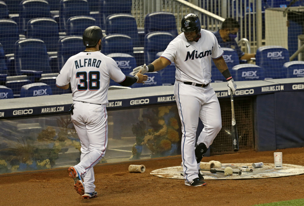 Miami Marlins shortstop Miguel Rojas (19) is congratulated by teammate Jesus Aguilar (24) after scoring during the seventh inning of a baseball game at at Marlins Park in Miami on Thursday, September 17, 2020. (David Santiago/Miami Herald/TNS)