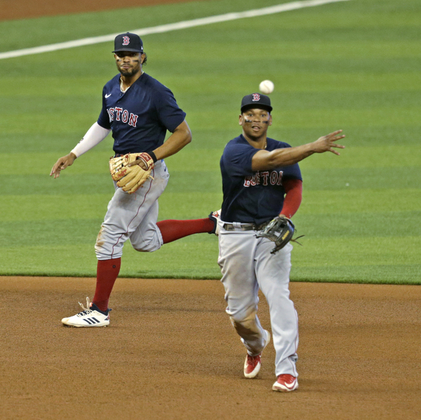 Boston Red Sox third baseman Rafael Devers (11) throws to first to put out Miami Marlins center fielder Starling Marte (6) during the seventh inning of a baseball game at at Marlins Park in Miami on Thursday, September 17, 2020. (David Santiago/Miami Herald/TNS)