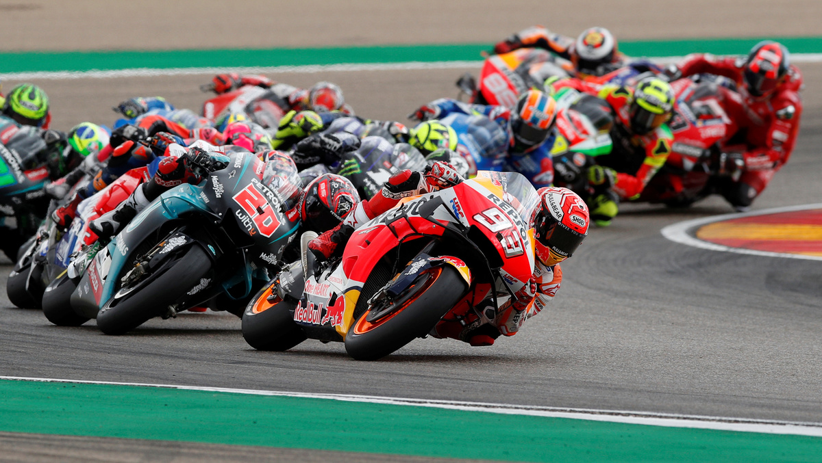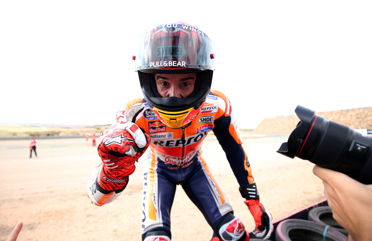 (Reuters) - Honda's Marc Marquez celebrated his 200th start and moved within reach of a sixth MotoGP title on Sunday with a commanding win from pole position in front of his home Spanish fans at the Aragon Grand Prix.