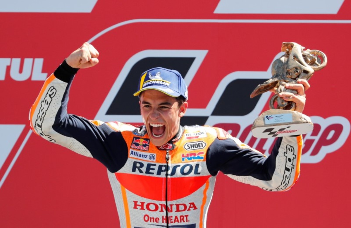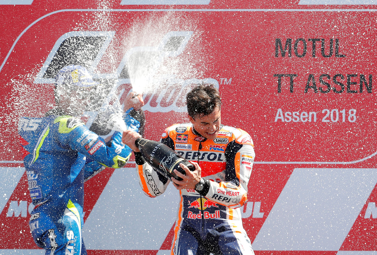 Motorcycling - MotoGP - TT Assen Grand Prix - TT Assen Circuit, Assen, Netherlands - July 1, 2018 Repsol Honda Team Marc Marquez celebrates winning the race on the podium REUTERS/Yves HermanMotorcycling - MotoGP - TT Assen Grand Prix -TT Assen Circuit, Assen, Netherlands - July 1, 2018 - Repsol Honda Team Marc Marquez of Spain in action during the race. REUTERS/Yves HermanMotorcycling - MotoGP - TT Assen Grand Prix -TT Assen Circuit, Assen, Netherlands - July 1, 2018 - Repsol Honda Team Marc Marquez celebrates winning the race. REUTERS/Yves Herman