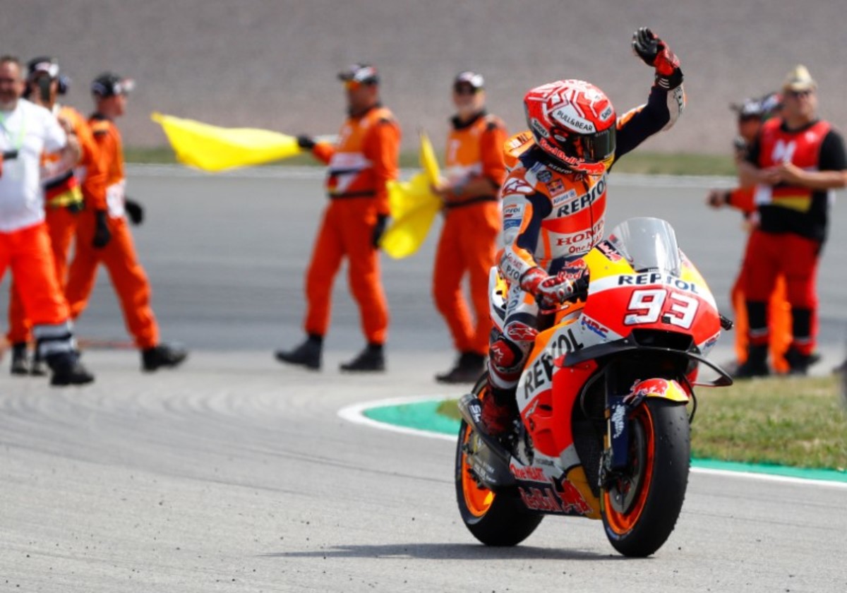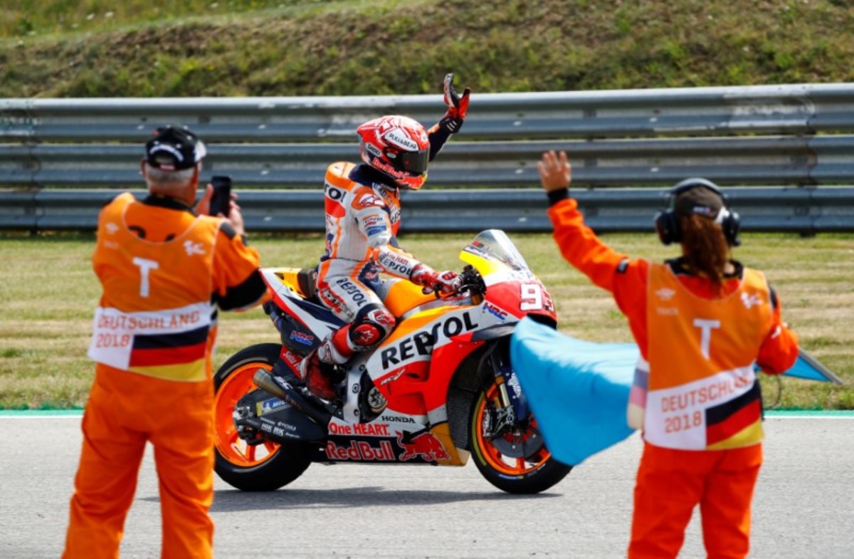 BERLIN (Reuters) - Honda's MotoGP champion Marc Marquez triumphed for the ninth year in a row in Germany on Sunday to stretch his lead over Italian great Valentino Rossi to 46 points ahead of the European summer break.