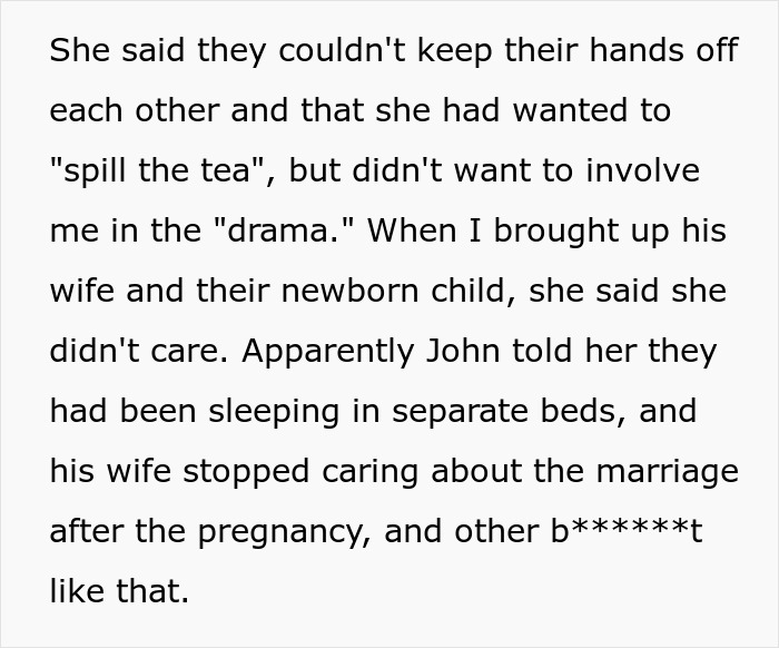 So, she confronted the friend, and it was revealed that she didn’t really care that John is a married father. He justified the affair by saying that the wife didn’t really care about the marriage after the birth. This explanation didn’t please the author, and she continued to feel disgusted.