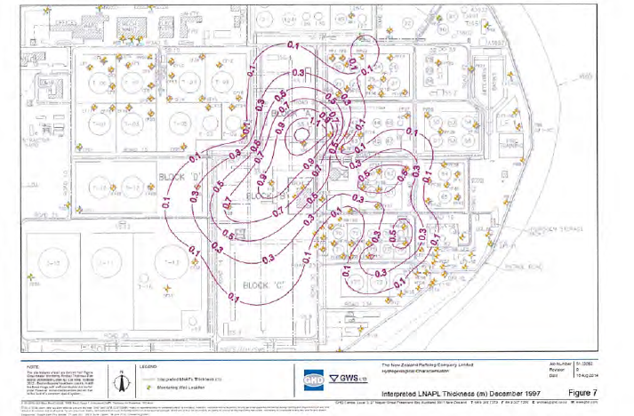 A 2020 hydrogeological report shows the extent and thickness of a plume of light fuel (LNAPL) under the refinery shrinking between 1997 and 2013.