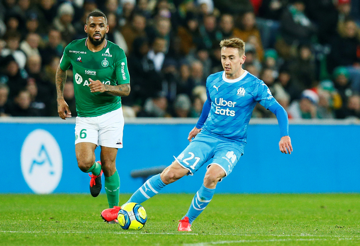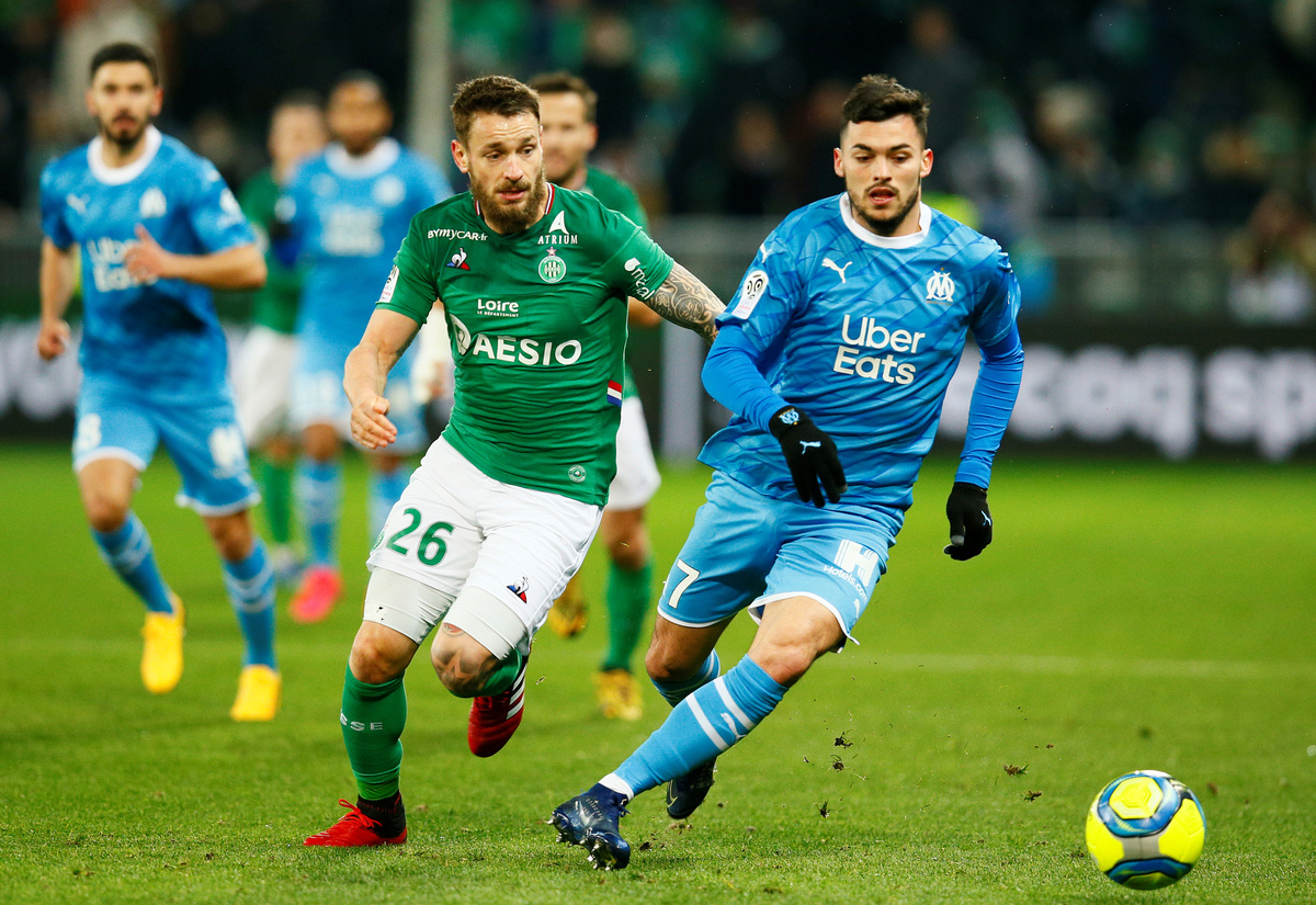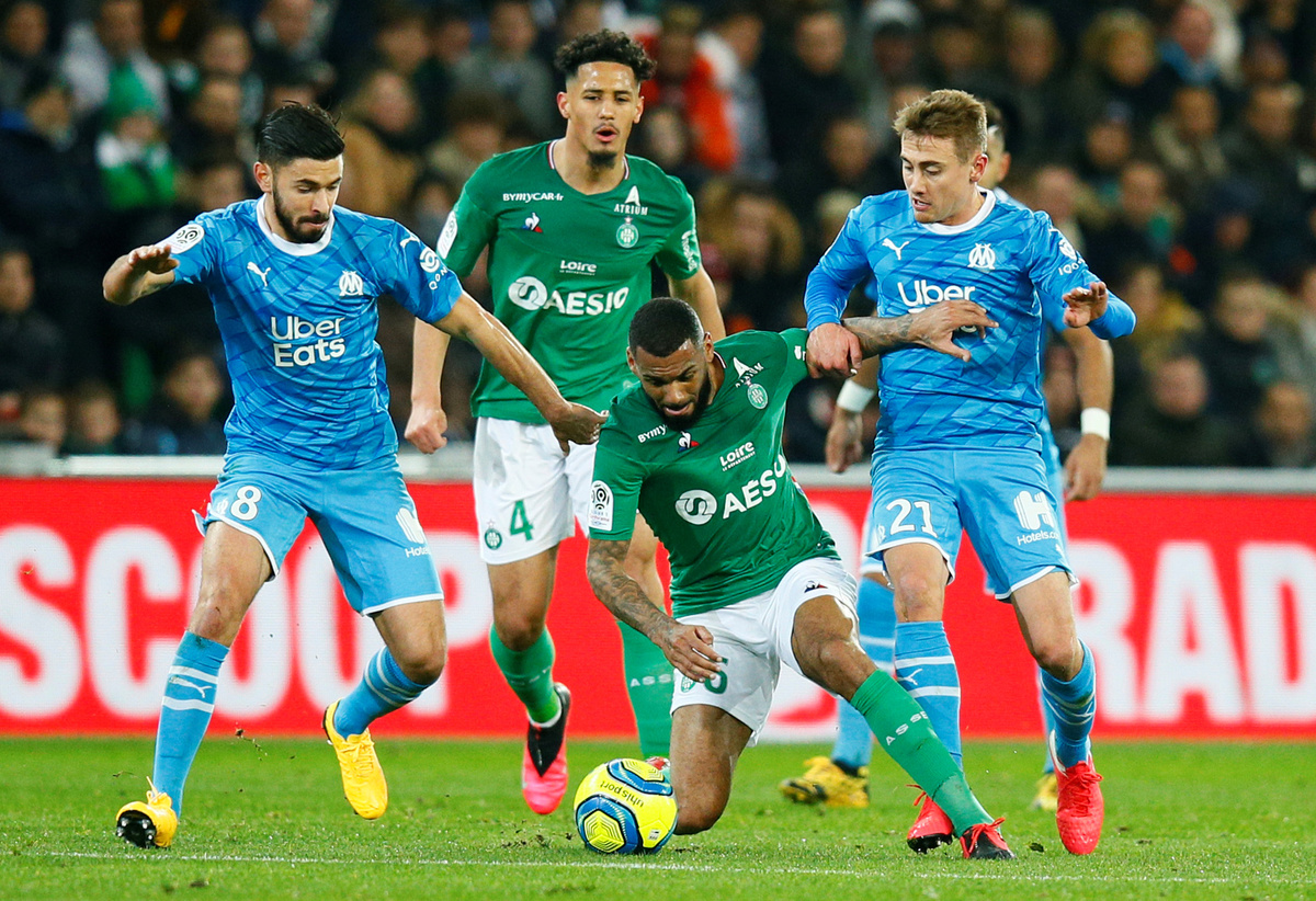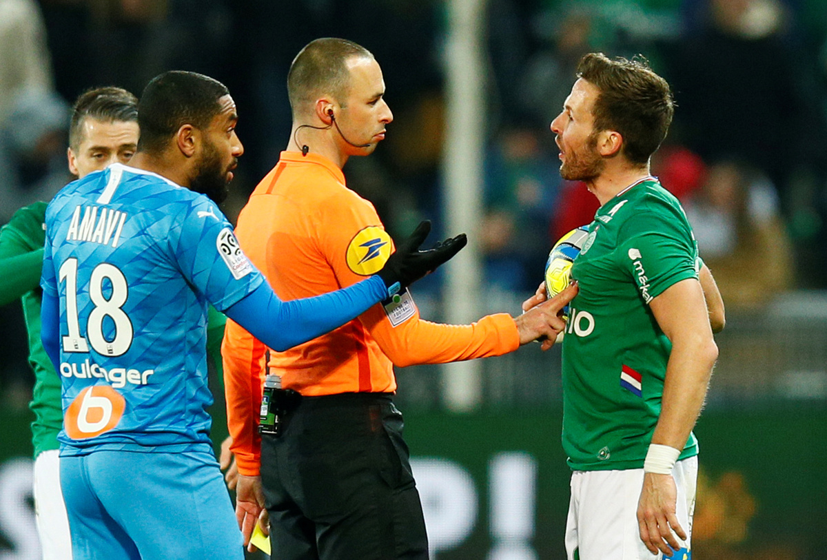 Soccer Football - Ligue 1 - AS Saint-Etienne v Olympique de Marseille - Stade Geoffroy-Guichard, Saint-Etienne, France - February 5, 2020 Saint Etienne's Yohan Cabaye speaks with referee Jerome Brisard as Olympique de Marseille's Jordan Amavi protests REUTERS/Emmanuel FoudrotSoccer Football - Ligue 1 - AS Saint-Etienne v Olympique de Marseille - Stade Geoffroy-Guichard, Saint-Etienne, France - February 5, 2020 Saint Etienne's William Saliba in action with Olympique de Marseille's Valentin Rongier REUTERS/Emmanuel FoudrotSoccer Football - Ligue 1 - AS Saint-Etienne v Olympique de Marseille - Stade Geoffroy-Guichard, Saint-Etienne, France - February 5, 2020 Saint Etienne's Yann M'Vila in action with Olympique de Marseille's Morgan Sanson and Valentin Rongier REUTERS/Emmanuel FoudrotSoccer Football - Ligue 1 - AS Saint-Etienne v Olympique de Marseille - Stade Geoffroy-Guichard, Saint-Etienne, France - February 5, 2020 Olympique de Marseille's Valentin Rongier in action with Saint Etienne's Yann M'Vila REUTERS/Emmanuel FoudrotSoccer Football - Ligue 1 - AS Saint-Etienne v Olympique de Marseille - Stade Geoffroy-Guichard, Saint-Etienne, France - February 5, 2020 Saint Etienne's Mathieu Debuchy in action with Olympique de Marseille's Nemanja Radonjic REUTERS/Emmanuel FoudrotSoccer Football - Ligue 1 - AS Saint-Etienne v Olympique de Marseille - Stade Geoffroy-Guichard, Saint-Etienne, France - February 5, 2020 Olympique de Marseille coach Andre Villas Boas is shown a yellow card by referee Jerome Brisard REUTERS/Emmanuel Foudrot