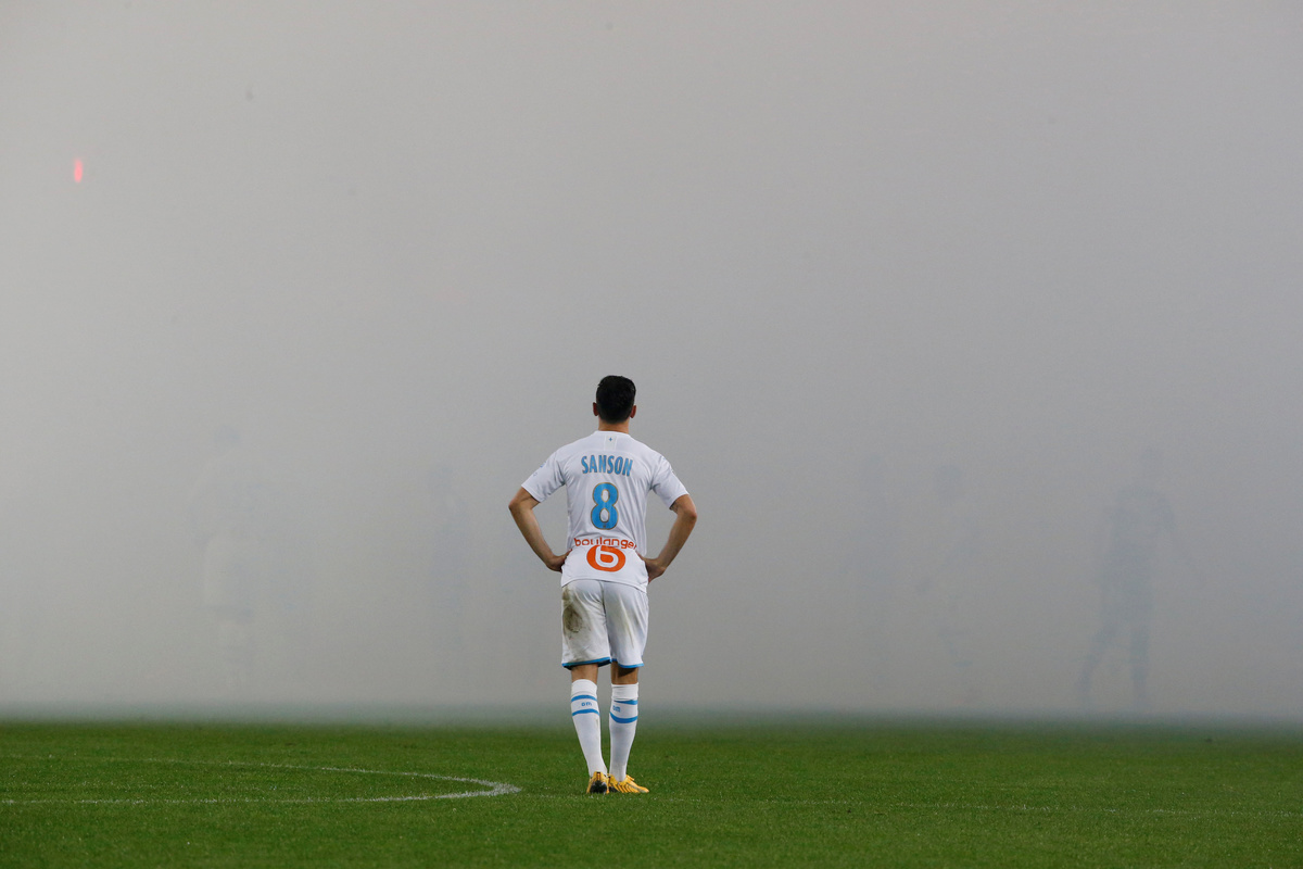 Soccer Football - Ligue 1 - Bordeaux v Olympique de Marseille - Matmut Atlantique, Bordeaux, France - February 2, 2020 Olympique de Marseille's Morgan Sanson looks on as smoke from flares obscures the pitch REUTERS/Regis Duvignau TPX IMAGES OF THE DAY