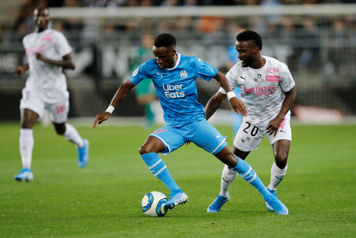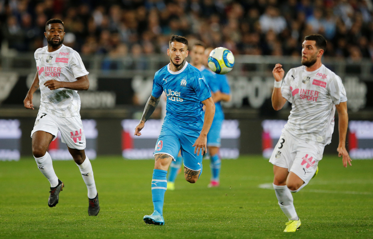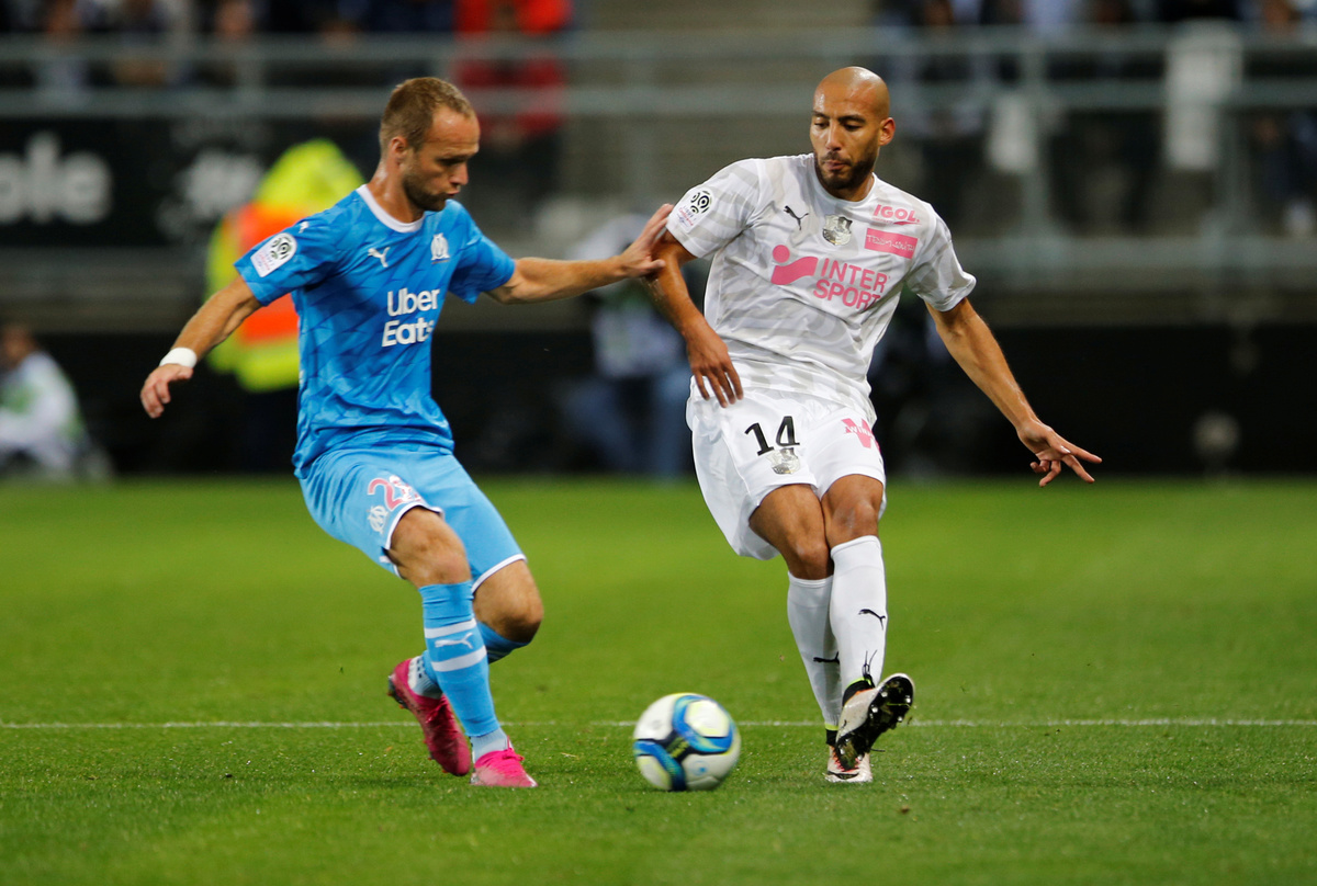 Soccer Football - Ligue 1 - Amiens SC vs Olympique de Marseille - Stade de la Licorne, Amiens, France - October 4, 2019 Olympique de Marseille's Valere Germain in action with Amiens' Haitam Aleesami REUTERS/Pascal Rossignol