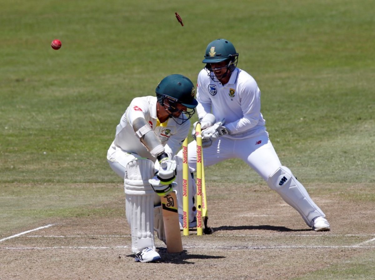 Hashim Amla (0) followed three balls later as Lyon dragged him forward and he played onto his pad to be snagged by Cameron Bancroft at short leg.