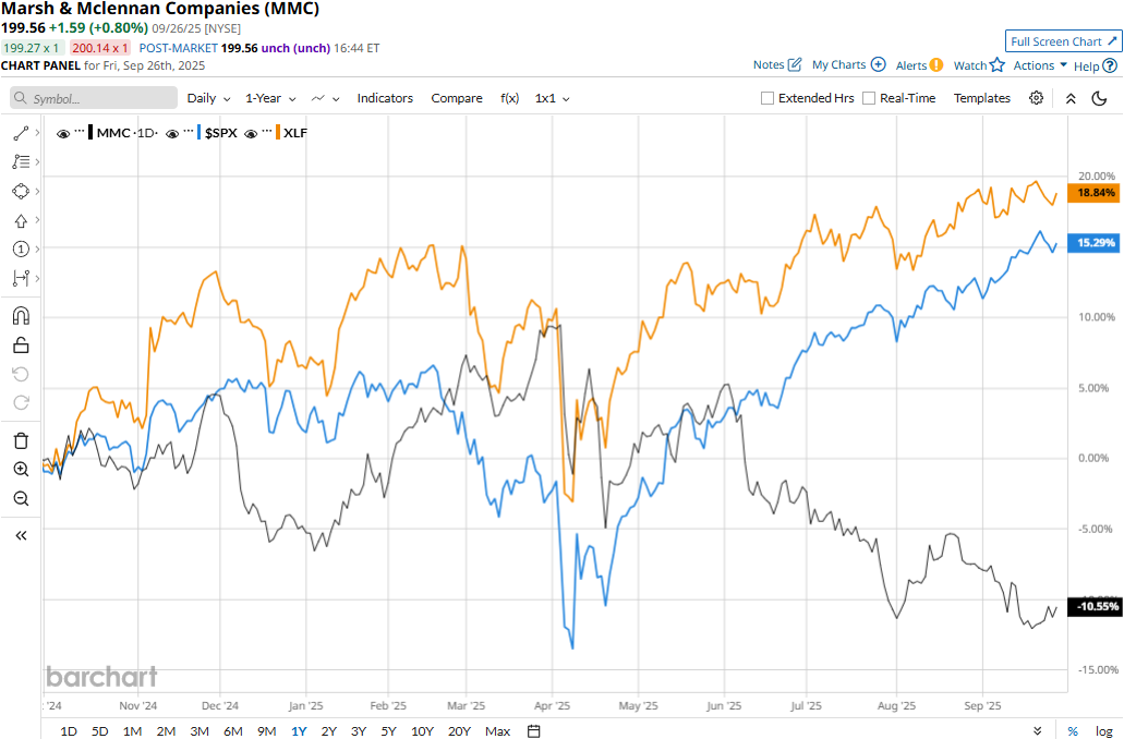 Marsh & McLennan’s stock prices have declined 10.8% over the past 52 weeks, notably underperforming the Financial Select Sector SPDR Fund’s (XLF) 19.6% surge and the S&P 500 Index’s ($SPX) 15.6% gains during the same time frame.