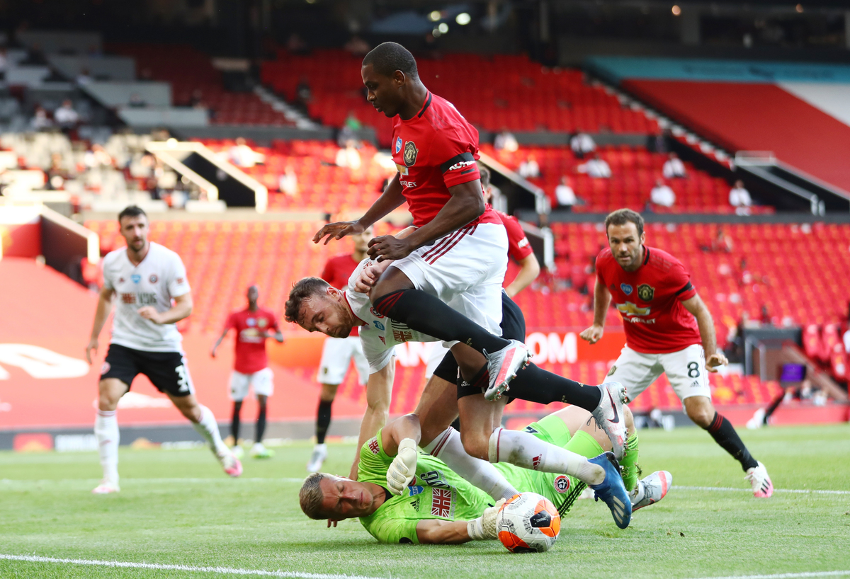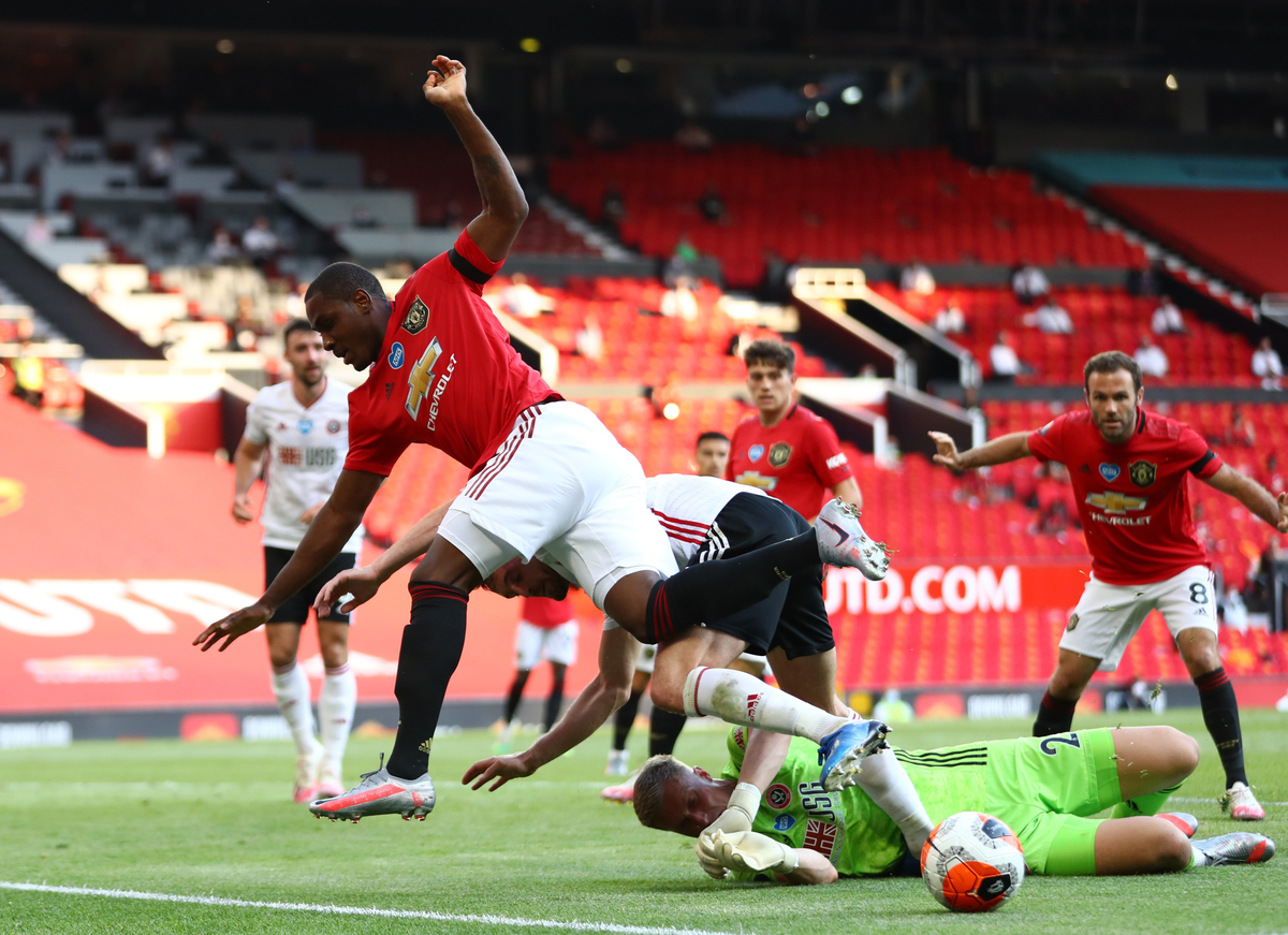 Soccer Football - Premier League - Manchester United v Sheffield United - Old Trafford, Manchester, Britain - June 24, 2020 Manchester United's Odion Ighalo in action with Sheffield United's Simon Moore, as play resumes behind closed doors following the outbreak of the coronavirus disease (COVID-19) Michael Steele/Pool via REUTERS