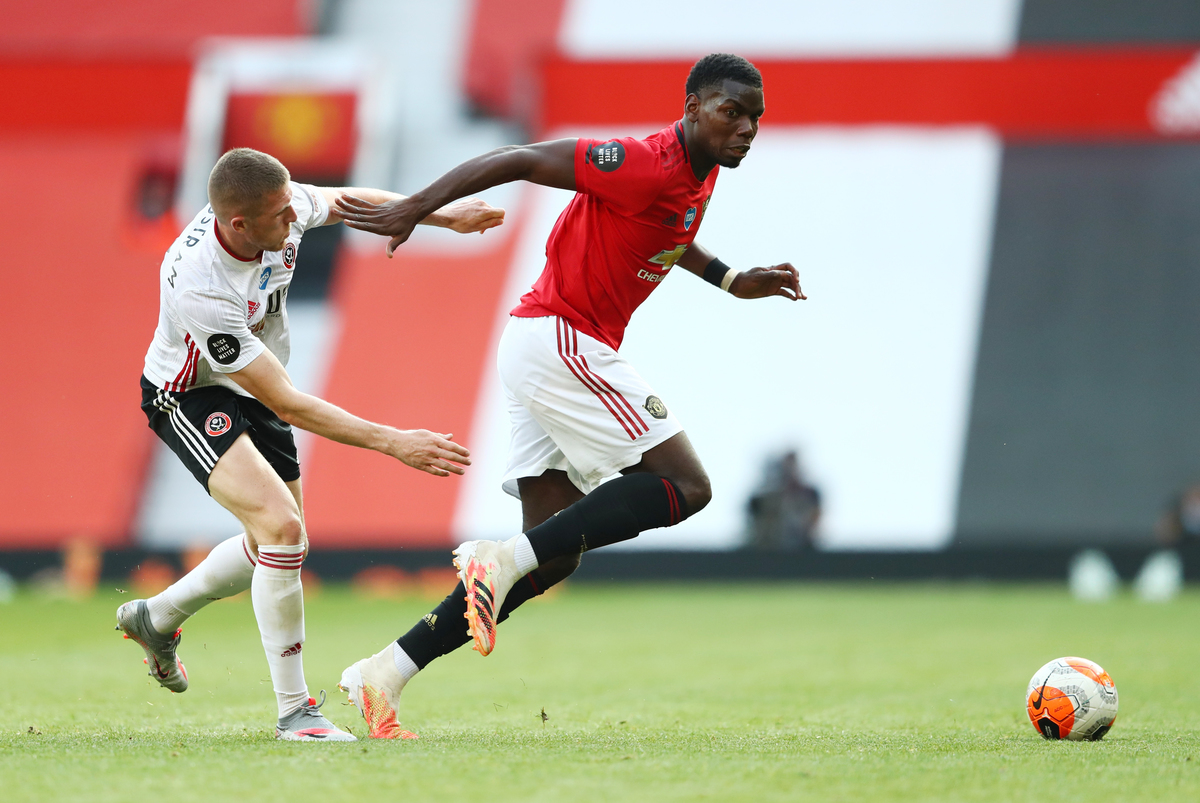 Soccer Football - Premier League - Manchester United v Sheffield United - Old Trafford, Manchester, Britain - June 24, 2020 Manchester United's Paul Pogba in action with Sheffield United's John Lundstram, as play resumes behind closed doors following the outbreak of the coronavirus disease (COVID-19) Michael Steele/Pool via REUTERS