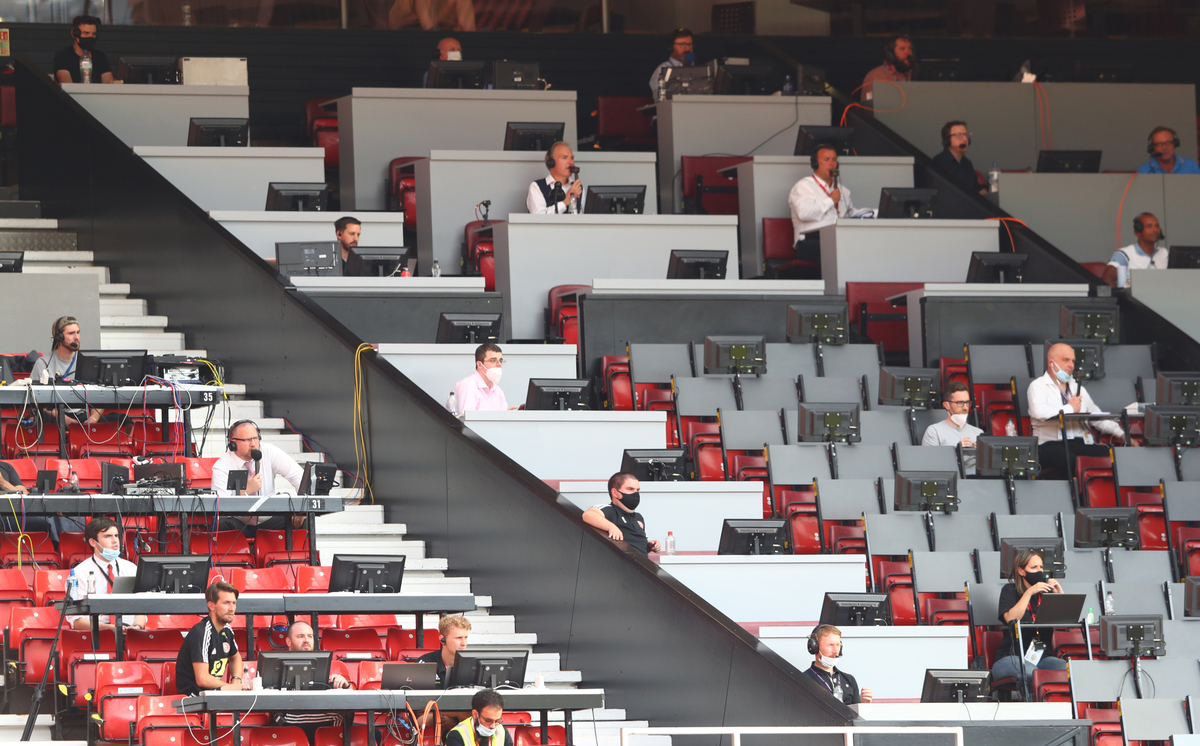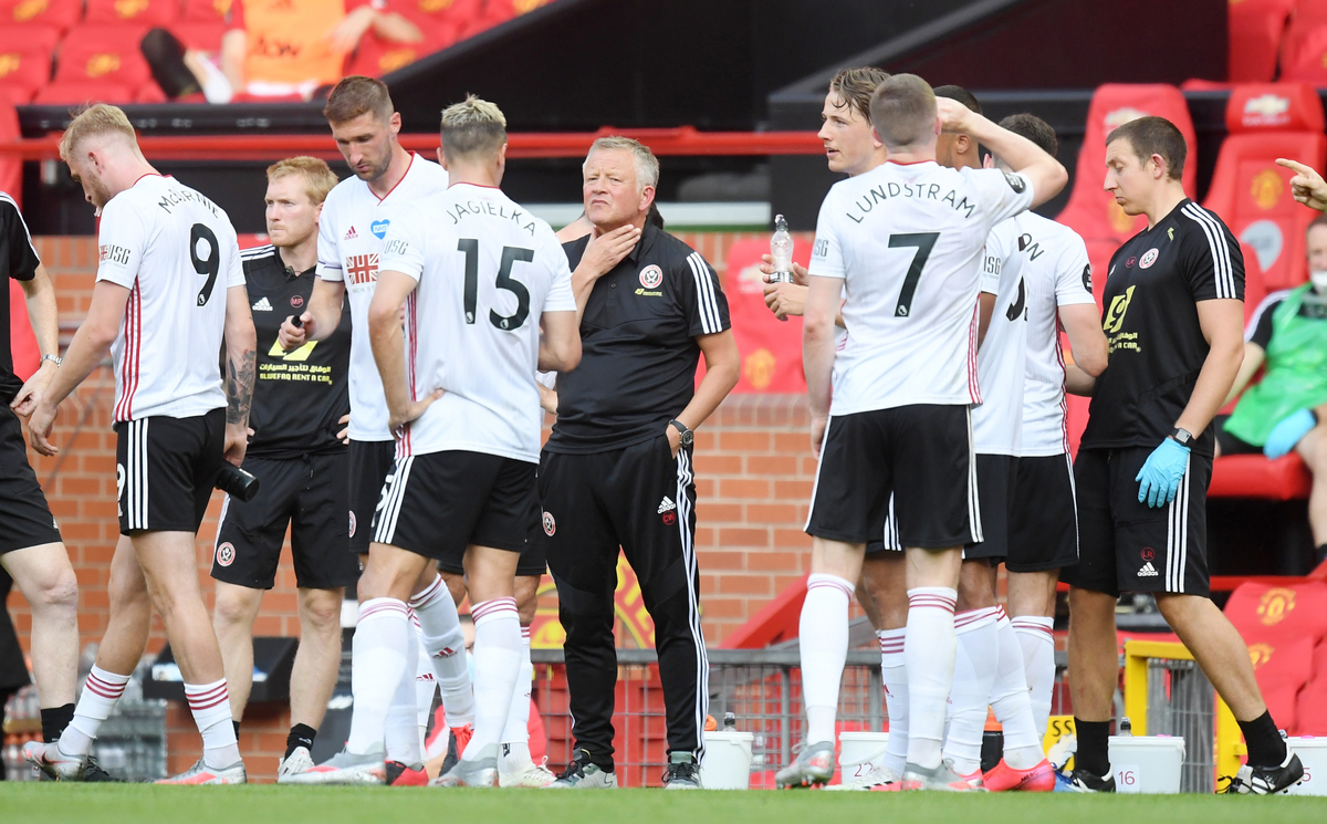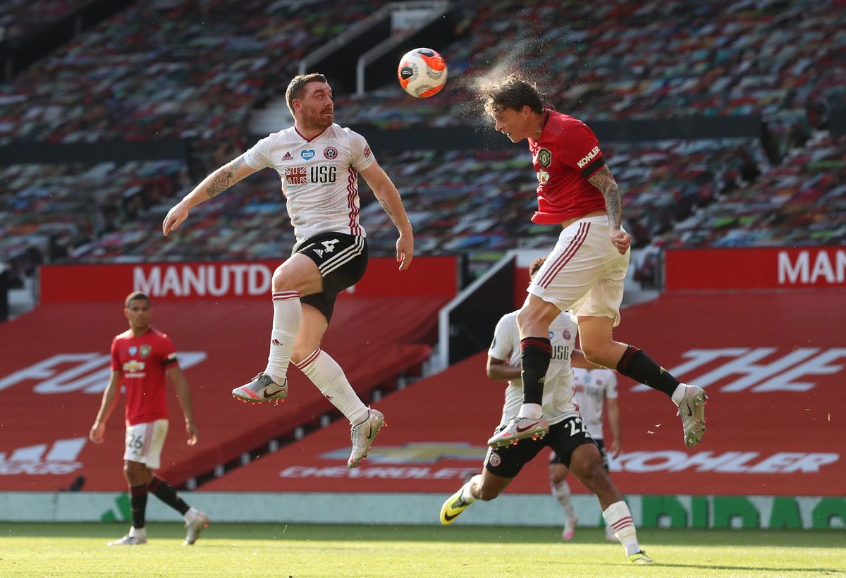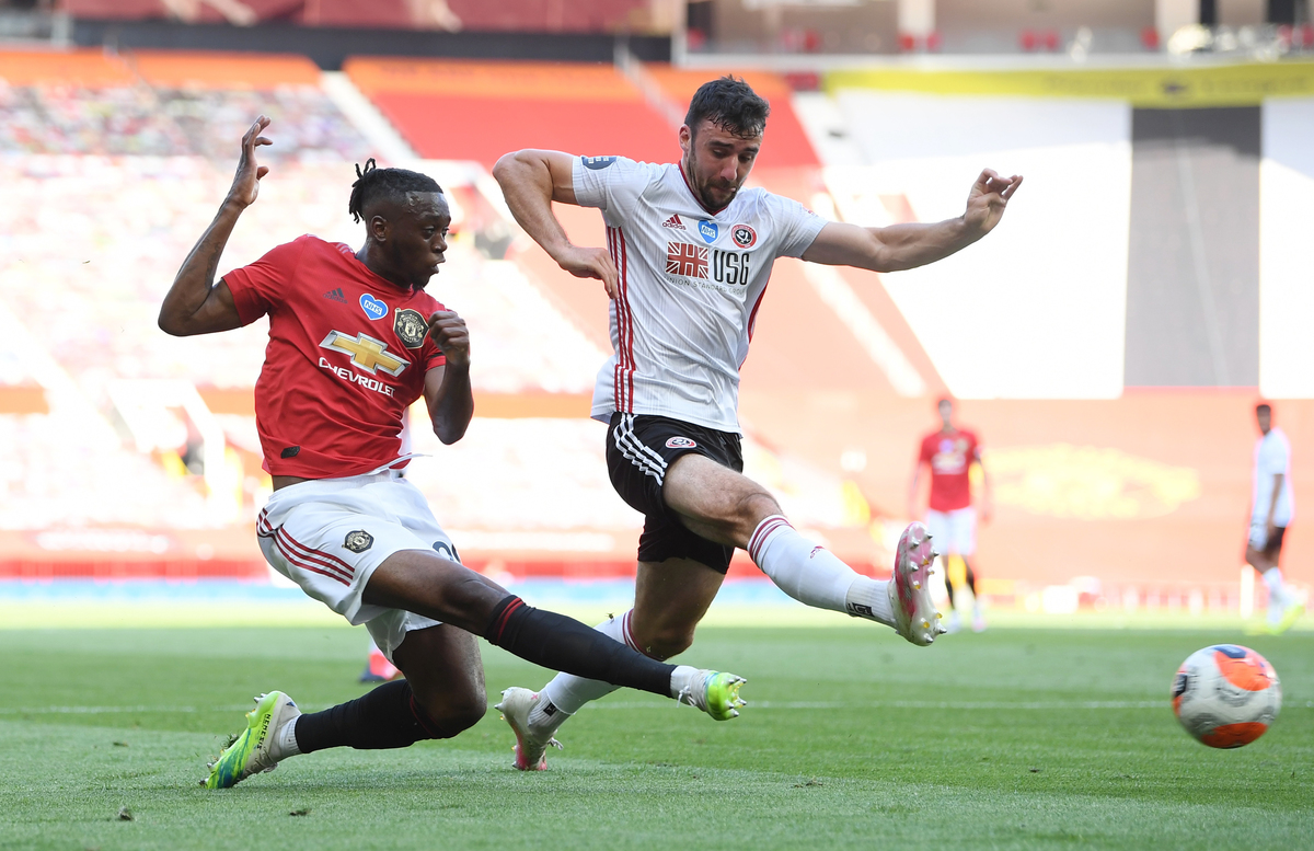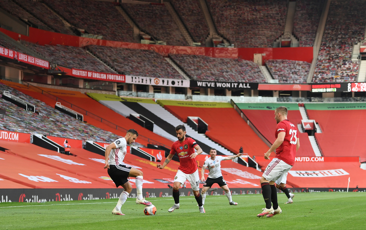 Soccer Football - Premier League - Manchester United v Sheffield United - Old Trafford, Manchester, Britain - June 24, 2020 Manchester United's Victor Lindelof in action with Sheffield United's John Fleck, as play resumes behind closed doors following the outbreak of the coronavirus disease (COVID-19) Martin Rickett/Pool via REUTERS Soccer Football - Premier League - Manchester United v Sheffield United - Old Trafford, Manchester, Britain - June 24, 2020 Manchester United manager Ole Gunnar Solskjaer and assistant coach Michael Carrick, as play resumes behind closed doors following the outbreak of the coronavirus disease (COVID-19) Martin Rickett/Pool via REUTERSSoccer Football - Premier League - Manchester United v Sheffield United - Old Trafford, Manchester, Britain - June 24, 2020 Manchester United's Odion Ighalo in action with Sheffield United's Simon Moore, as play resumes behind closed doors following the outbreak of the coronavirus disease (COVID-19) Michael Steele/Pool via REUTERS Soccer Football - Premier League - Manchester United v Sheffield United - Old Trafford, Manchester, Britain - June 24, 2020 General view of the action, as play resumes behind closed doors following the outbreak of the coronavirus disease (COVID-19) Michael Regan/Pool via REUTERS Soccer Football - Premier League - Manchester United v Sheffield United - Old Trafford, Manchester, Britain - June 24, 2020 Manchester United's Aaron Wan-Bissaka crosses the ball for Anthony Martial to score the second goal as Sheffield United's Enda Stevens looks on, as play resumes behind closed doors following the outbreak of the coronavirus disease (COVID-19) Michael Regan/Pool via REUTERS Soccer Football - Premier League - Manchester United v Sheffield United - Old Trafford, Manchester, Britain - June 24, 2020 Sheffield United's George Baldock in action with Manchester United's Bruno Fernandes and Luke Shaw, as play resumes behind closed doors following the outbreak of the coronavirus disease (COVID-19) Michael Regan/Pool via REUTERS Soccer Football - Premier League - Manchester United v Sheffield United - Old Trafford, Manchester, Britain - June 24, 2020 Manchester United's Anthony Martial celebrates with Paul Pogba after scoring their third goal to complete his hat-trick, as play resumes behind closed doors following the outbreak of the coronavirus disease (COVID-19) Michael Steele/Pool via REUTERS Soccer Football - Premier League - Manchester United v Sheffield United - Old Trafford, Manchester, Britain - June 24, 2020 Manchester United's Anthony Martial celebrates with teammates after scoring their third goal to complete his hat-trick, as play resumes behind closed doors following the outbreak of the coronavirus disease (COVID-19) Michael Regan/Pool via REUTERS Soccer Football - Premier League - Manchester United v Sheffield United - Old Trafford, Manchester, Britain - June 24, 2020 Sheffield United's Oliver McBurnie in the stands with fellow substitutes, as play resumes behind closed doors following the outbreak of the coronavirus disease (COVID-19) Michael Regan/Pool via REUTERS Soccer Football - Premier League - Manchester United v Sheffield United - Old Trafford, Manchester, Britain - June 24, 2020 Sheffield United manager Chris Wilder speaks with his players during a drinks break, as play resumes behind closed doors following the outbreak of the coronavirus disease (COVID-19) Michael Regan/Pool via REUTERS Soccer Football - Premier League - Manchester United v Sheffield United - Old Trafford, Manchester, Britain - June 24, 2020 Members of the media in the stands, as play resumes behind closed doors following the outbreak of the coronavirus disease (COVID-19) Michael Steele/Pool via REUTERS