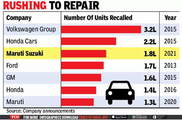 NEW DELHI: Maruti Suzuki on Friday announced a recall of as many as 1.8 lakh cars sold between May 4, 2018 and October 27, 2020, to replace a faulty motor generator unit.