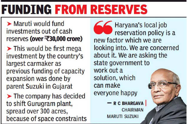 NEW DELHI: Maruti Suzuki is lining up the country’s largest single-location automobile investment as it plans to pump in up to Rs 18,000 crore for a new factory premises in Haryana, which may have a peak annual capacity of 10 lakh units, Maruti Suzuki chairman R C Bhargava told TOI.