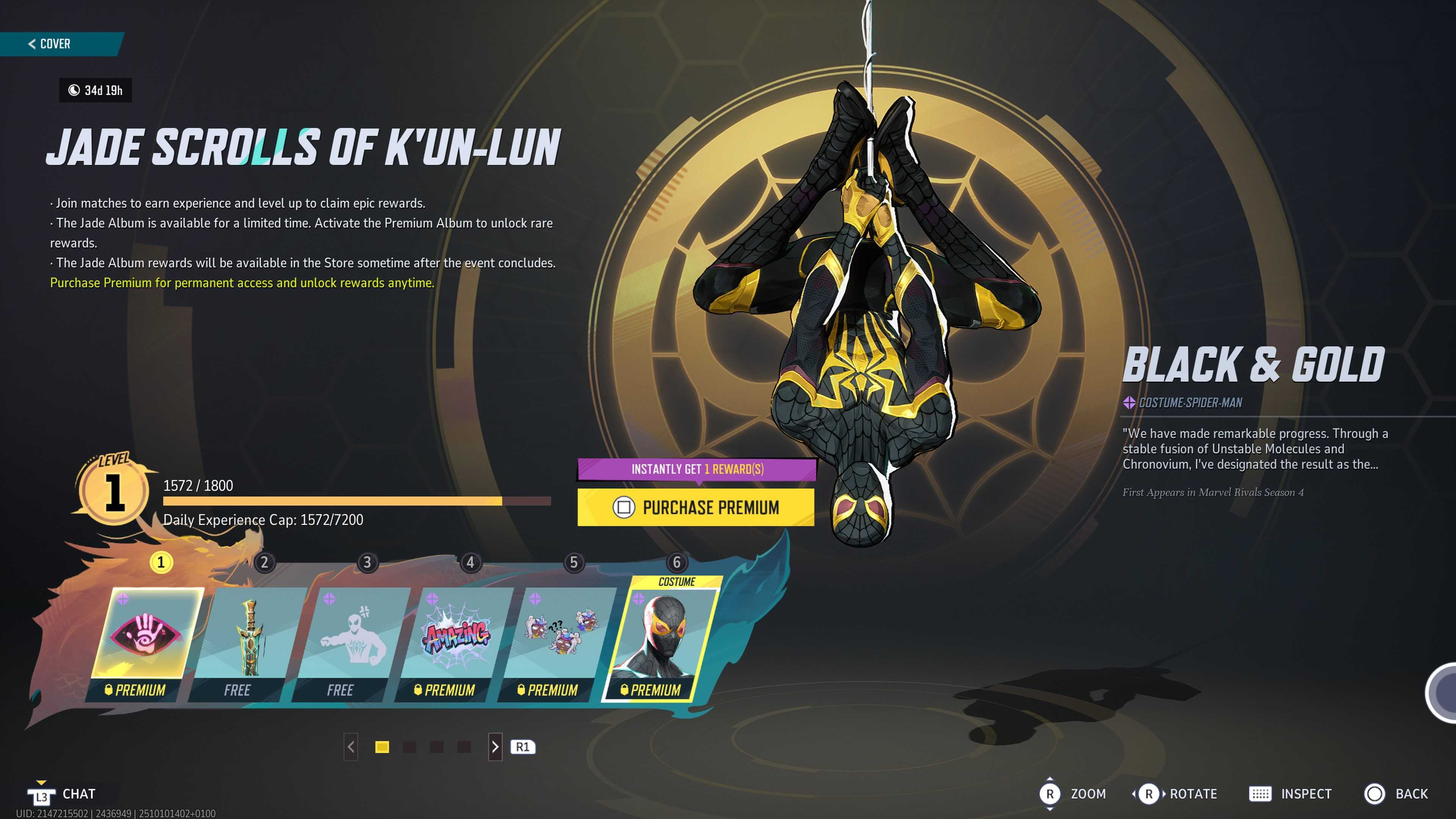 The Jade Scrolls of K’un-Lun event features a bunch of new skins to earn. The first page has a Black and Gold Spider-Man costume, which is an original design for Season 4.5.