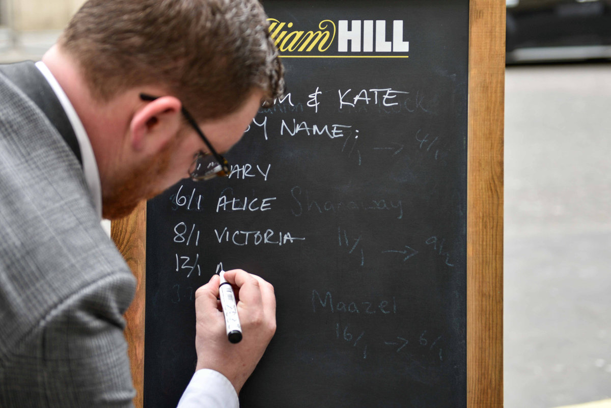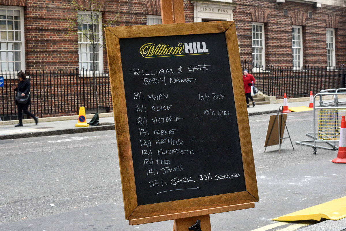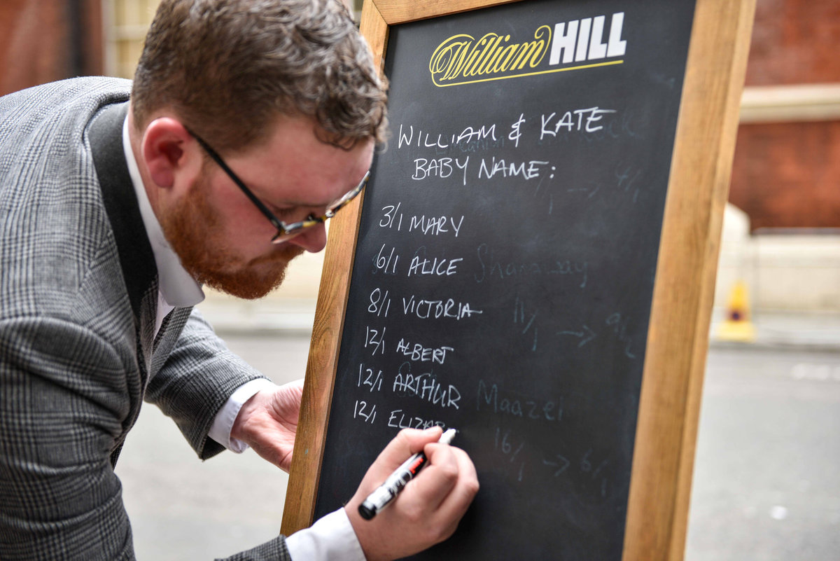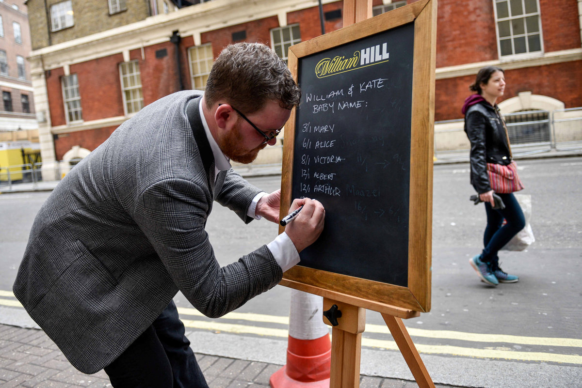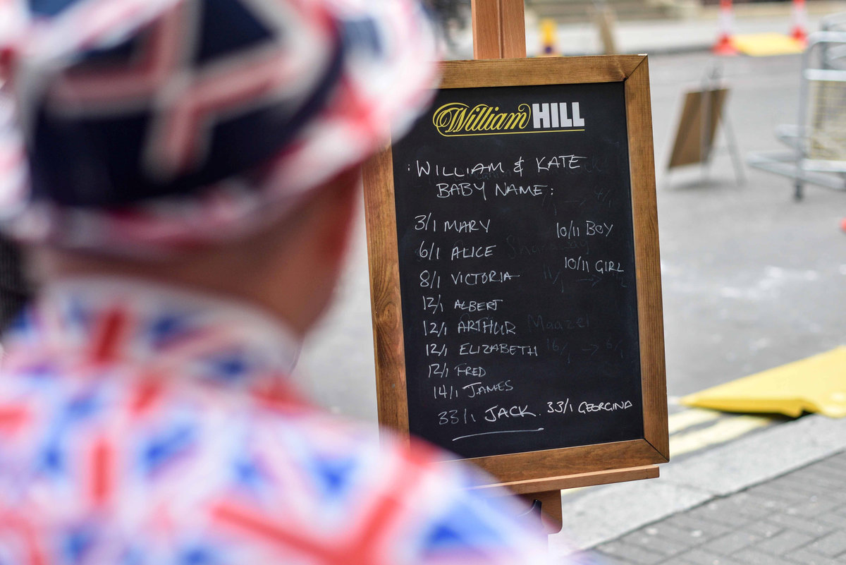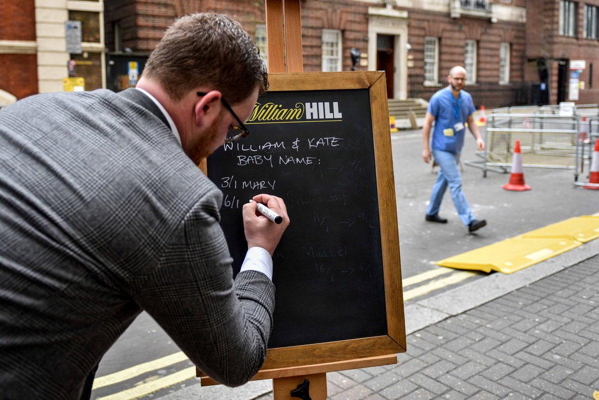 Joe Crilly, a spokesperson from the bookmaker William Hill, writes the names and betting odds for the third royal baby of Britain's Prince William and Catherine, Duchess of Cambridge, on a board outside the Lindo Wing St Mary's Hospital in west London, Britain, April 13, 2018. REUTERS/Peter SummersA man dressed in a Union Jack suit looks at the names and betting odds for the third royal baby of Britain's Prince William and Catherine, Duchess of Cambridge, on a board outside the Lindo Wing St Mary's Hospital in west London, Britain, April 13, 2018. REUTERS/Peter SummersJoe Crilly, a spokesperson from the bookmaker William Hill, writes the names and betting odds for the third royal baby of Britain's Prince William and Catherine, Duchess of Cambridge, on a board outside the Lindo Wing St Mary's Hospital in west London, Britain, April 13, 2018. REUTERS/Peter SummersJoe Crilly, a spokesperson from the bookmaker William Hill, writes the names and betting odds for the third royal baby of Britain's Prince William and Catherine, Duchess of Cambridge, on a board outside the Lindo Wing St Mary's Hospital in west London, Britain, April 13, 2018. REUTERS/Peter SummersJoe Crilly, a spokesperson from the bookmaker William Hill, writes the names and betting odds for the third royal baby of Britain's Prince William and Catherine, Duchess of Cambridge, on a board outside the Lindo Wing St Mary's Hospital in west London, Britain, April 13, 2018. REUTERS/Peter SummersJoe Crilly, a spokesperson from the bookmaker William Hill, writes the names and betting odds for the third royal baby of Britain's Prince William and Catherine, Duchess of Cambridge, on a board outside the Lindo Wing St Mary's Hospital in west London, Britain, April 13, 2018. REUTERS/Peter Summers
