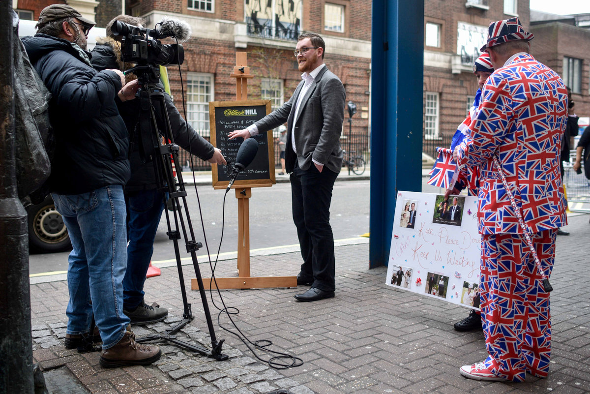 Joe Crilly, a spokesperson from the bookmaker William Hill, is interviewed by a televsion crew as he writes the names and betting odds for the third royal baby of Britain's Prince William and Catherine, Duchess of Cambridge, on a board outside the Lindo Wing St Mary's Hospital in west London, Britain, April 13, 2018. REUTERS/Peter Summers
