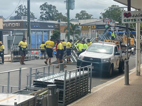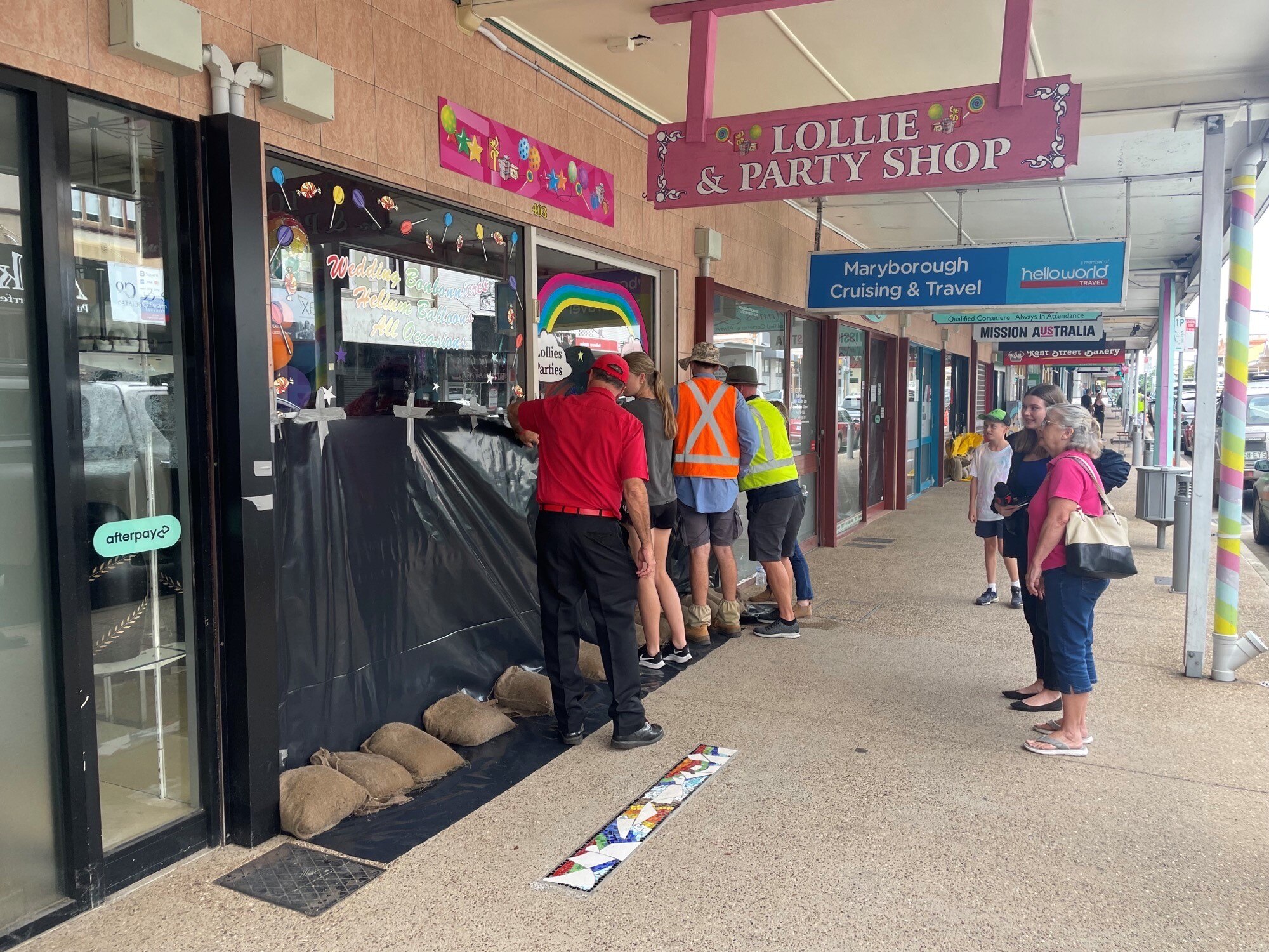 A levee was erected to protect businesses in the CBD, as prisoners from the Maryborough Correctional Centre filled sandbags made available at Bunnings and the city's Granville Hall.