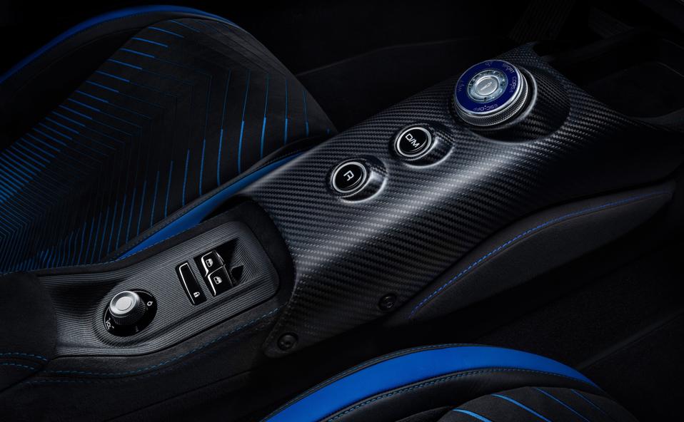 The MC20’s exterior options serve both visual and performance needs. The exterior carbon fiber pack adds a carbon fiber front splitter, carbon fiber rear diffuser, carbon fiber rocker panels, a carbon fiber hood and dark exhaust tips for $35,000. The standard 20-inch “birdcage” alloy wheels wear Bridgestone Potenza Sport tires, sized 245/35 in front and 305/30 in back. Performance enhancements on our test model included a carbon ceramic brake system ($10,000) and an electronic limited slip differential ($2,300), along with blue brake calipers ($1,200) and a front lift system ($4,000), the last a prude item on any car with the carbon fiber front splitter.