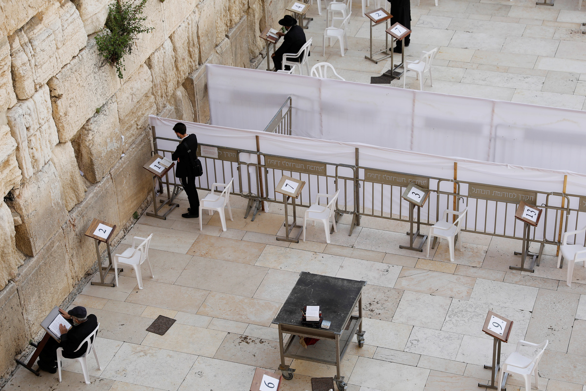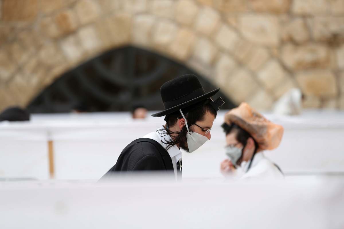 Jewish worshippers wear face masks as they pray by the Western Wall, Judaism's holiest prayer site, where partitioned areas were set for worshippers to adhere to the coronavirus disease (COVID-19) restrictions on large gatherings, in Jerusalem May 6, 2020 REUTERS/Ronen Zvulun