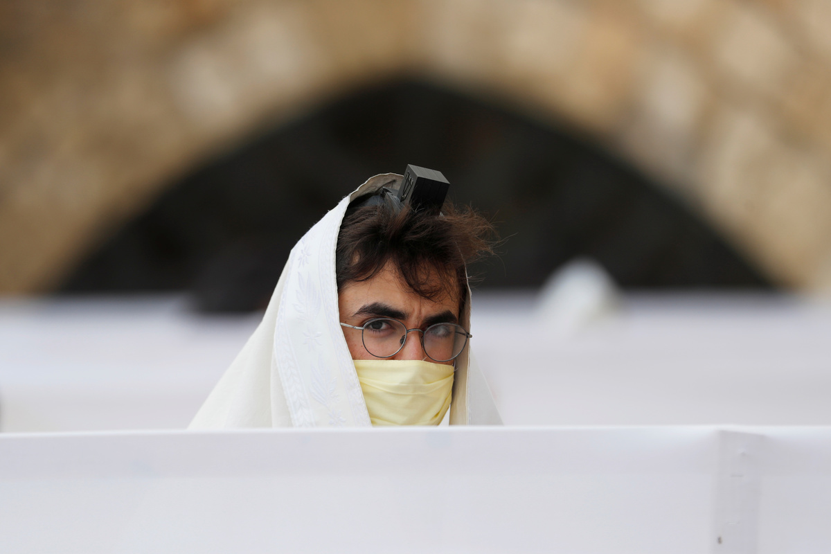 A Jewish worshipper wears a face mask as he prays by the Western Wall, Judaism's holiest prayer site, where partitioned areas were set for worshippers to adhere to the coronavirus disease (COVID-19) restrictions on large gatherings, in Jerusalem May 6, 2020. REUTERS/Ronen Zvulun