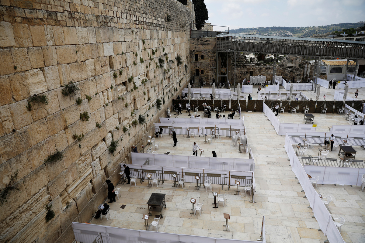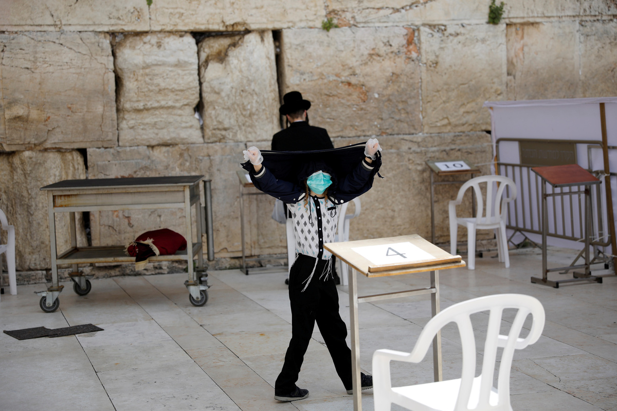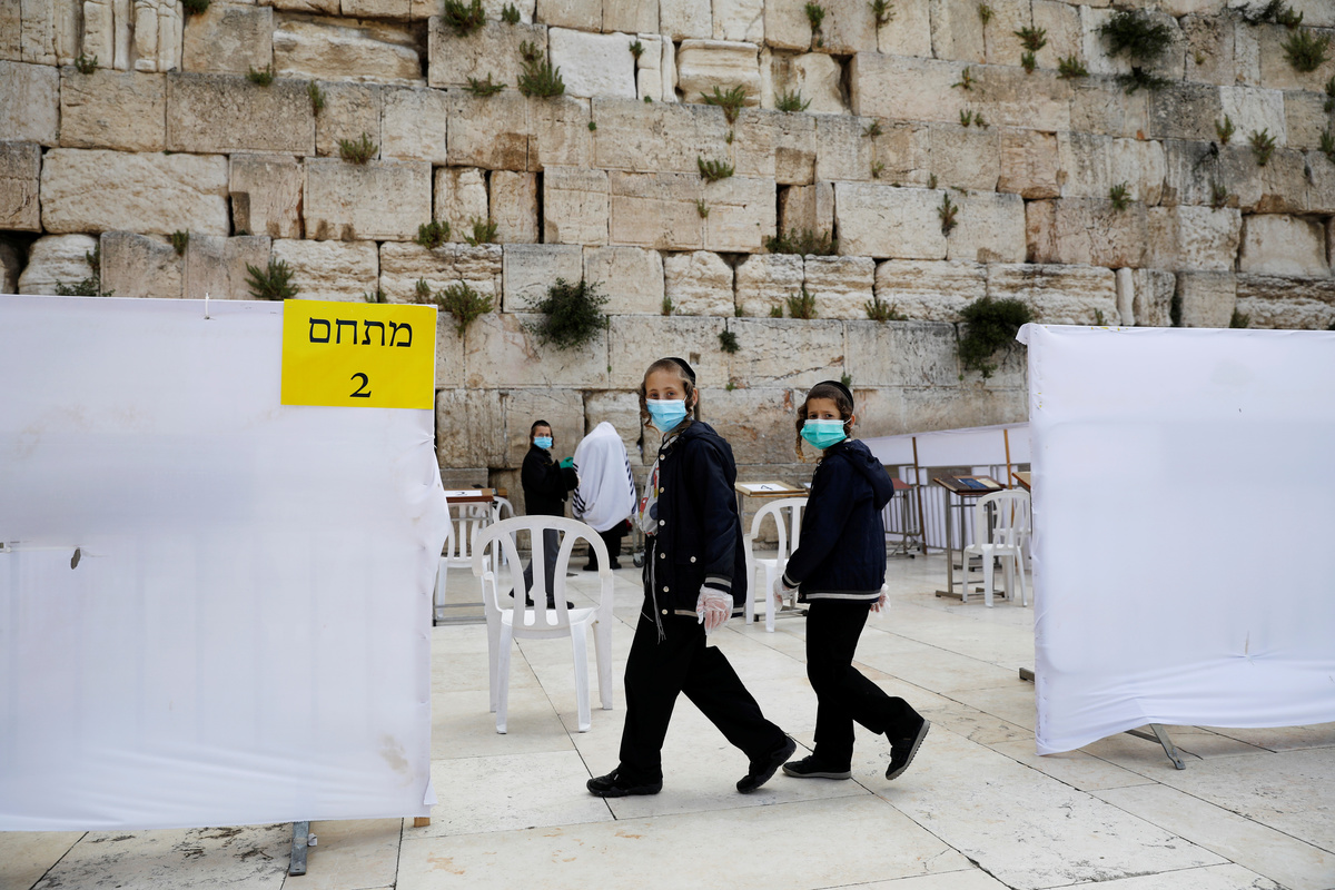 Boys wear face masks at the plaza of the Western Wall, Judaism's holiest prayer site, where partitioned areas were set for worshippers to adhere to the coronavirus disease (COVID-19) restrictions on large gatherings, in Jerusalem May 6, 2020 REUTERS/ Ronen ZvulunA man blocks a worshipper from getting closer to the Western Wall, Judaism's holiest prayer site, where partitioned areas were set for worshippers to adhere to coronavirus (COVID-19) restrictions on large gatherings, in Jerusalem May 6, 2020. REUTERS/Ronen ZvulunJewish worshippers wear face masks as they pray by the Western Wall, Judaism's holiest prayer site, where partitioned areas were set for worshippers to adhere to coronavirus (COVID-19) restrictions on large gatherings, in Jerusalem May 6, 2020. REUTERS/Ronen ZvulunA general view shows the plaza of the Western Wall, Judaism's holiest prayer site, with partitioned areas for worshippers to adhere to the coronavirus disease (COVID-19) restrictions on large gatherings in Jerusalem May 6, 2020. REUTERS/Ronen ZvulunA boy poses wearing a face mask at the plaza of the Western Wall, Judaism's holiest prayer site, where partitioned areas were set for worshippers to adhere to the coronavirus disease (COVID-19) restrictions on large gatherings, in Jerusalem May 6, 2020. REUTERS/Ronen Zvulun