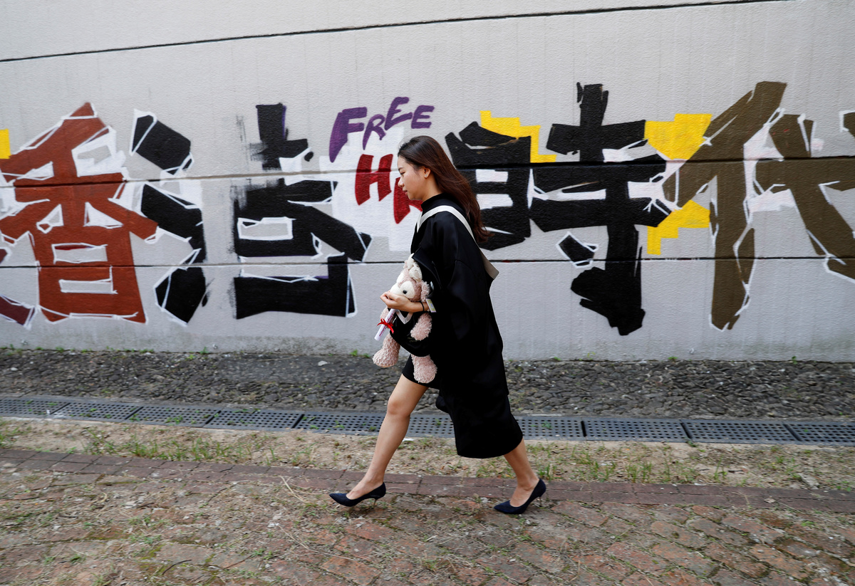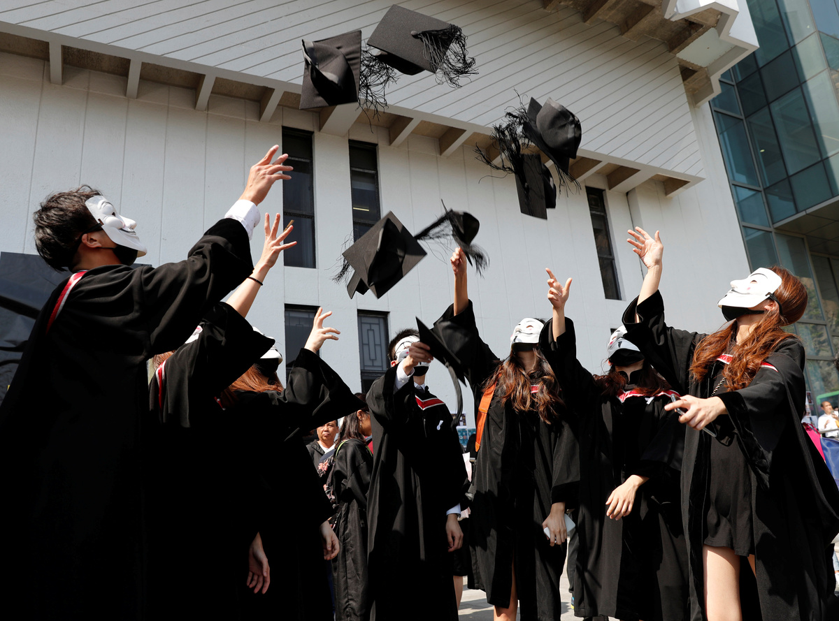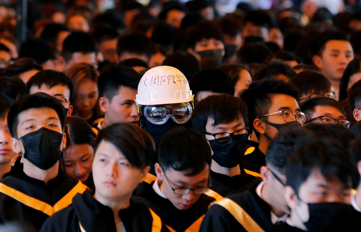 HONG KONG (Reuters) - Hong Kong students, many wearing banned black masks, chanted slogans at their graduation at the Chinese University on Thursday, with some holding up banners urging "Free Hong Kong, Revolution Now".