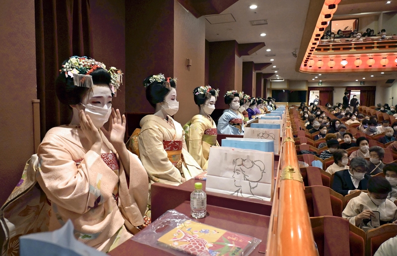 Geiko traditional female entertainers and maiko apprentices attend a show to study the art of kabuki in an annual year-end event at the Minamiza Theatre in Kyoto on Friday. Geiko and maiko from the city's five hanamachi entertainment districts usually participate in the event. On the first day, about 50 of them from the Miyagawacho district, who refrained from doing so last year due to the pandemic, watched a performance of "The Festive Kaomise Production: Grand Kabuki Starring Actors from the East and West." The show, which runs through Dec. 23, will be attended by more geiko and maiko from the remaining four districts next week.
