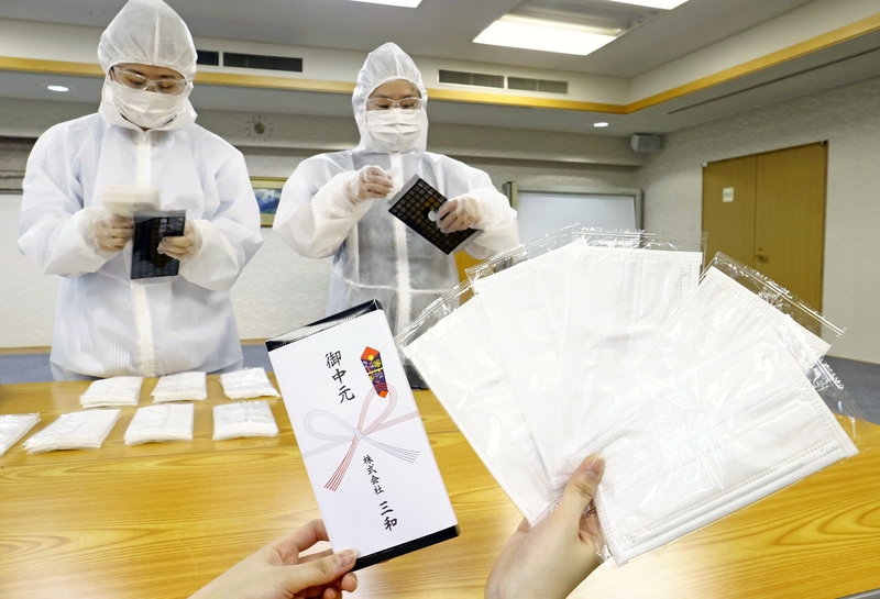Many are turning to giving masks for their ochugen midyear gift this summer as masks are still hard to find following the spread of the coronavirus. At Hotel Blancvert Nasu in Nasu, Tochigi Prefecture, employees attached a paper with the word "Ochugen" (summer gift) to boxes that each had five masks inside.