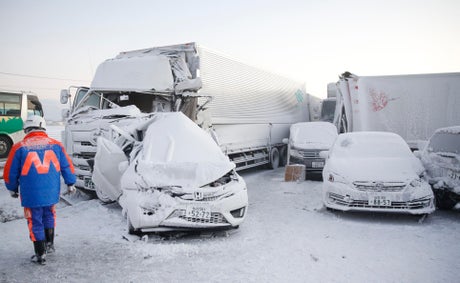 Traffic authorities had imposed a 50 kilometer (30 mile) per hour speed limit at the time of the accident because of low visibility due to the snow storm, Kato said.