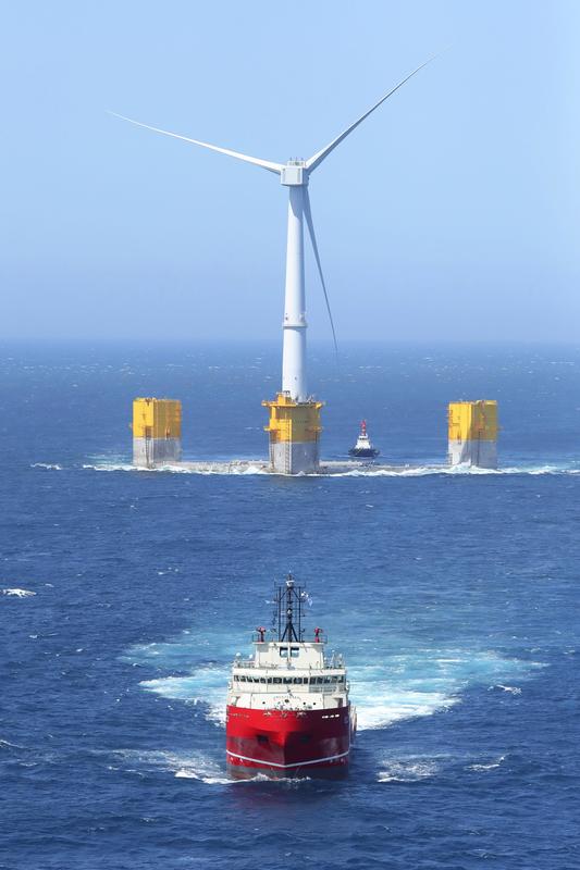 Located 20 kilometers off the coast of Fukushima Prefecture, the 7,000-kilowatt wind turbine, called Fukushima Shimpu, has a rotor 167 meters in diameter. The consortium, which includes Marubeni Corp. and the University of Tokyo, has been studying technical issues and the feasibility of commercializing the technology.