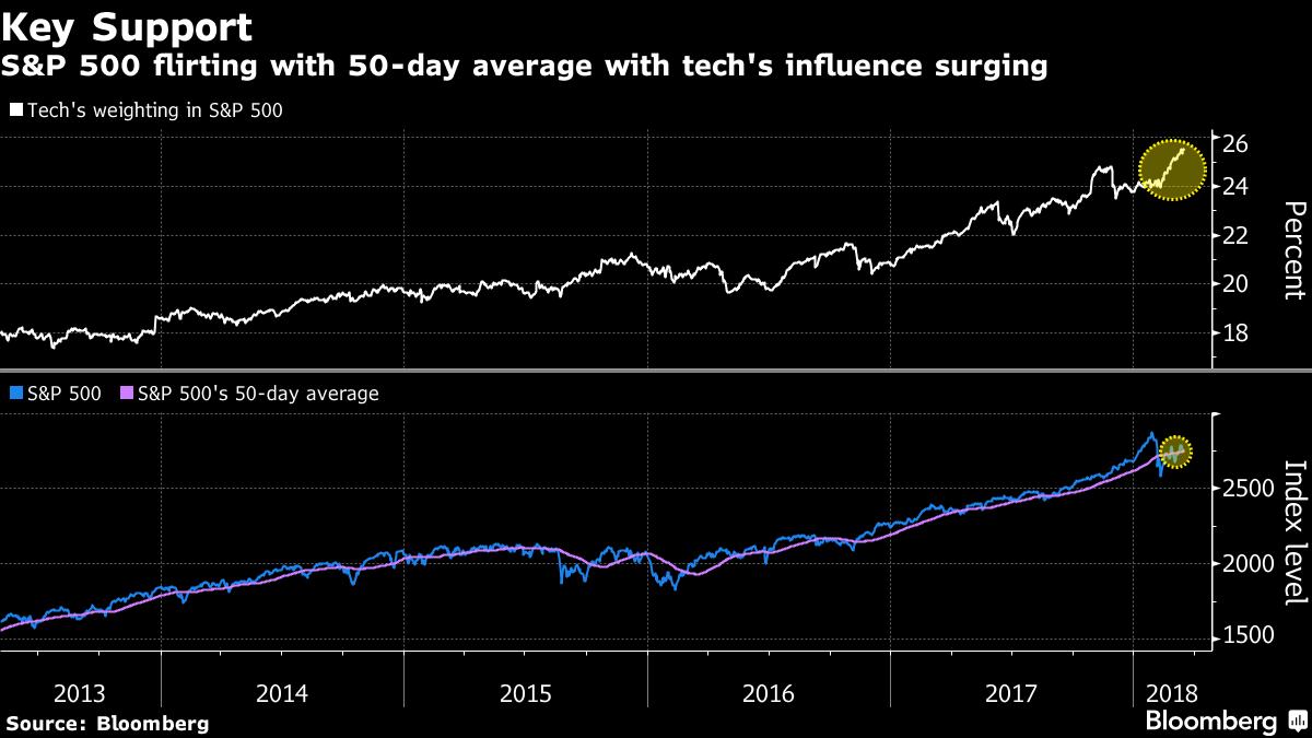 The selloff in tech stocks, the market’s biggest winner in 2018, comes at an inconvenient time for the S&P 500, which now hovers near its 50-day moving average after oscillating around the key level over the past month. The industry, the biggest in the benchmark index with 25 percent representation, is also the only one that has fully recovered from the February rout and climbed to fresh highs.