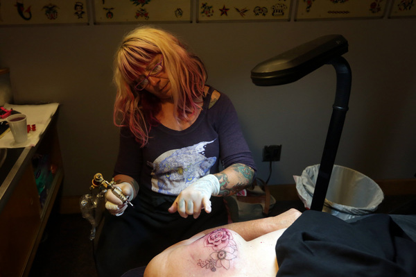 She makes appointments for her mastectomy patients in the morning, before the Delmar Loop studio is officially open. It's quiet and private. The tattoo stalls are empty.